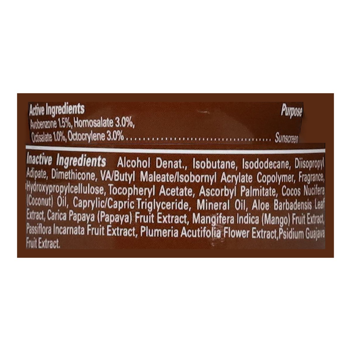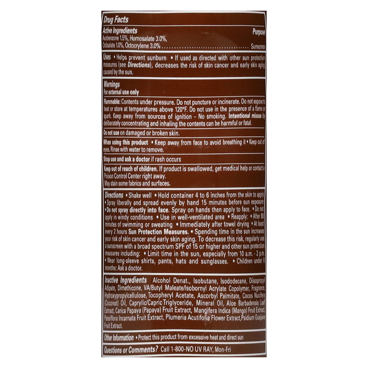 Active Ingredients: Avobenzone 1.5%, Homosalate 3%, Octisalate 1%, Octocrylene 3%. Inactive Ingredients: Alcohol Denat., Isobutane, Isododecane, Diisopropyl Adipate, Dimethicone, VA/Butyl Maleate/lsob…
