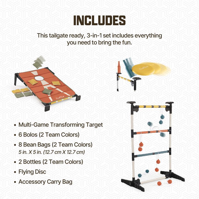 - 3 Classic Tailgate Games in 1 Set – Enjoy Cornhole, Ladderball, and Bottle Smash with one transforming target for endless outdoor fun.