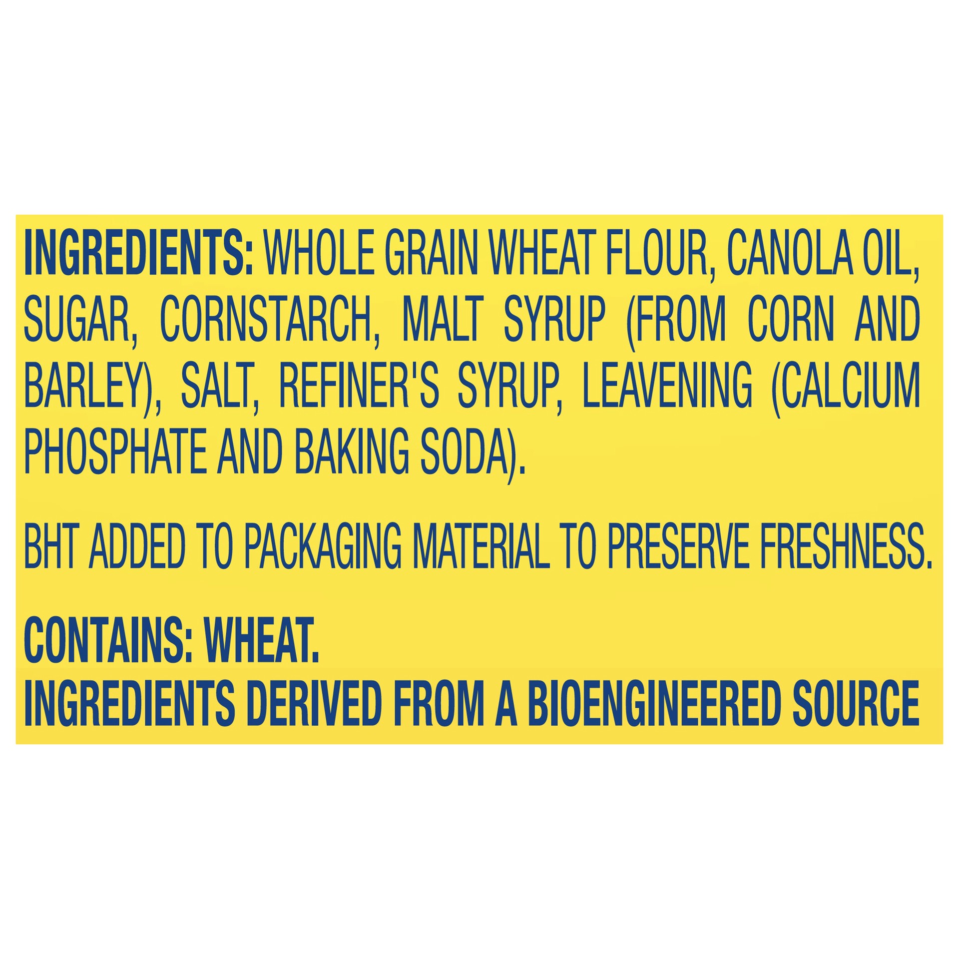 INGREDIENTS: WHOLE GRAIN WHEAT FLOUR, CANOLA OIL, SUGAR, CORNSTARCH, MALT SYRUP (FROM CORN AND BARLEY), SALT, REFINER''S SYRUP, LEAVENING (CALCIUM PHOSPHATE, BAKING SODA). BHT ADDED TO PACKAGING MATER…