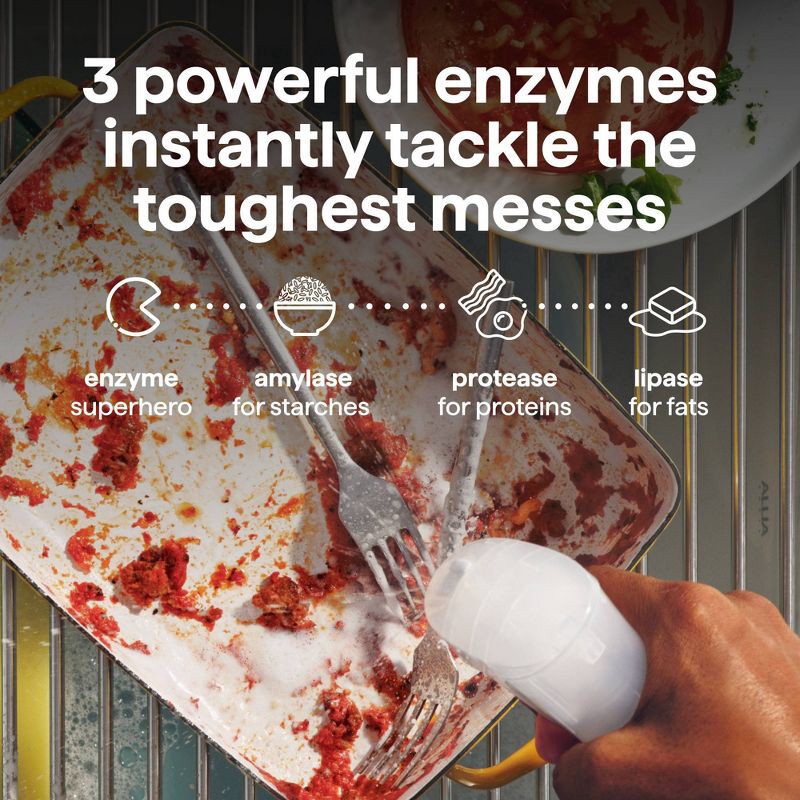 - GRIME DOESN'T STAND A CHANCE: Grime-fighting foam powered by 3 different enzymes that instantly start eating away and lifting the toughest messes. Unique enzymes blast away specific foods, like amylase for starches, protease for proteins, and lipase for fats