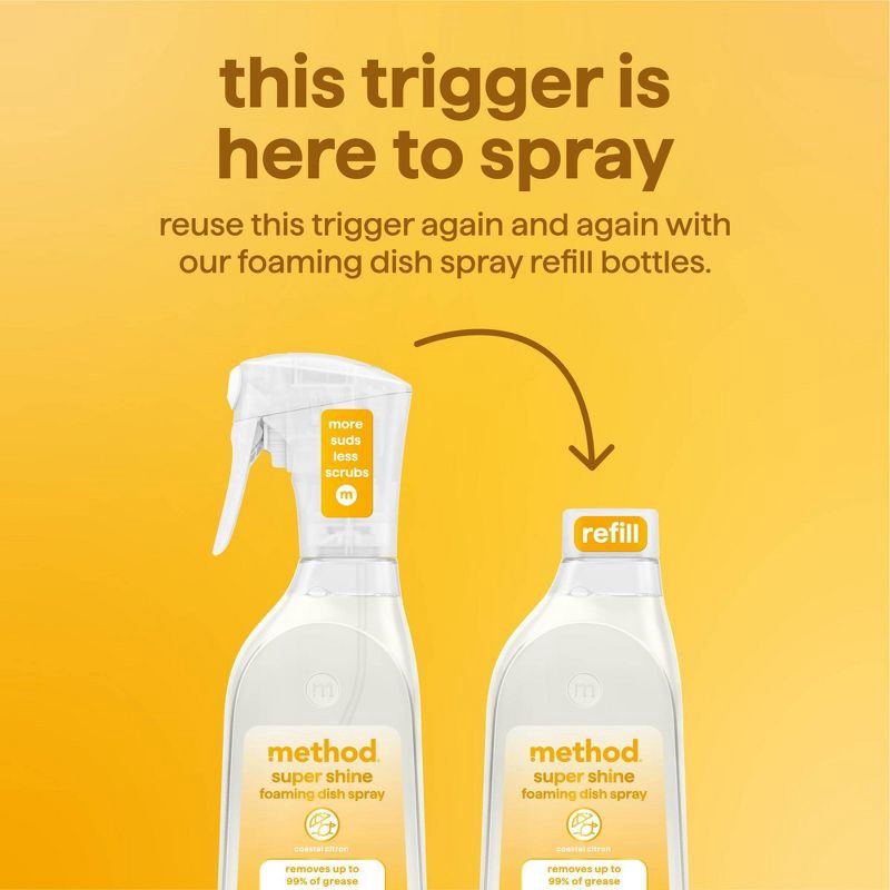 - DESIGNED WITH THE FUTURE IN MIND: Bottle made from 100% collected + recycled coastal plastic (minus trigger). Reuse the trigger again and again with method super shine dish spray refills.