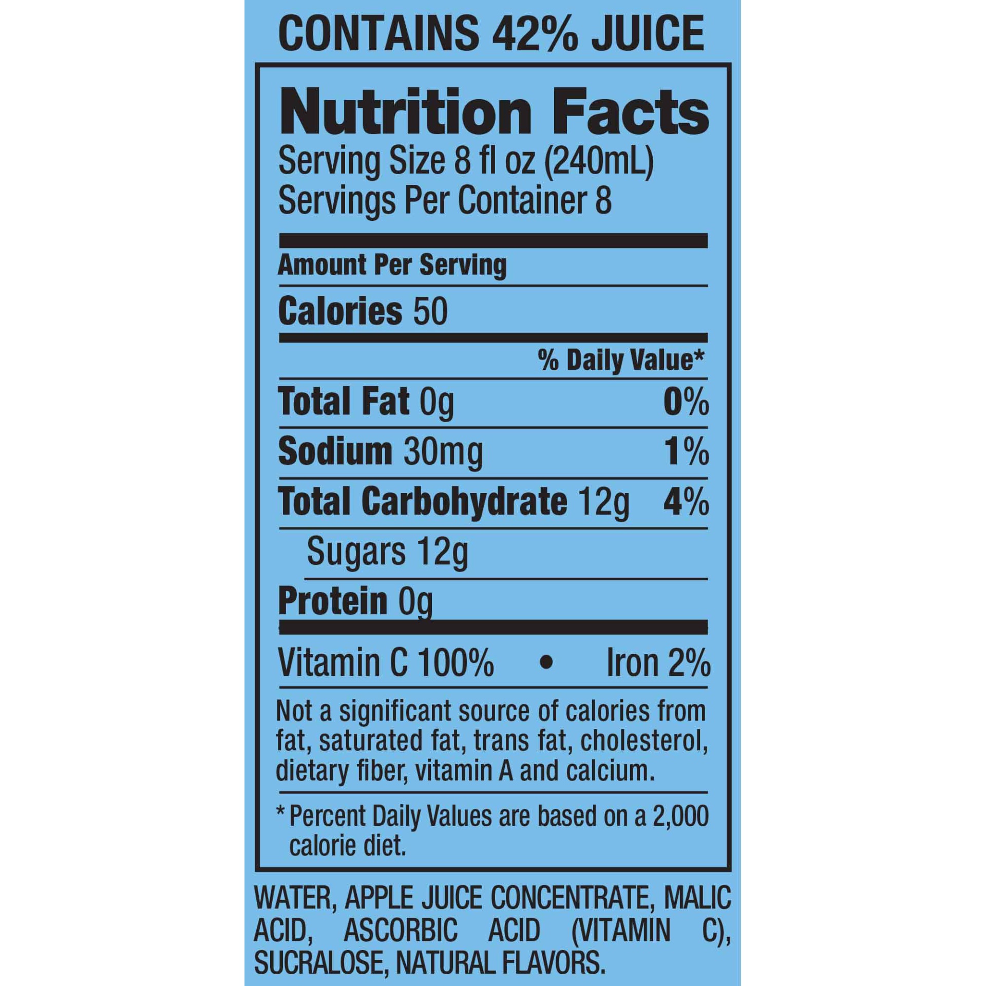 Water, Apple Juice Concentrate, Malic Acid, Ascorbic Acid (Vitamin C), Sucralose, Natural Flavors.