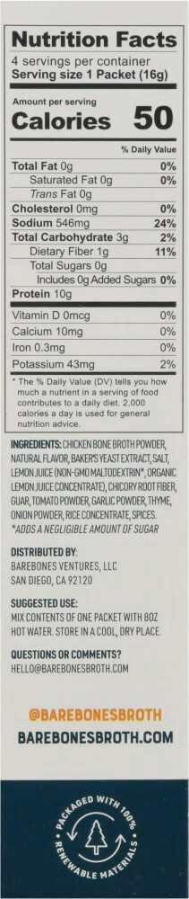 Ingredients:Chicken Bone Broth Powder, Natural Flavor, Baker'S Yeast Extract, Salt, Lemon Juice (Non-Gmomaltodextrin*, Organic Lemon Juice Concentrate), Chicory Root Fiber, Guar, Tomato Powder,Garlic …