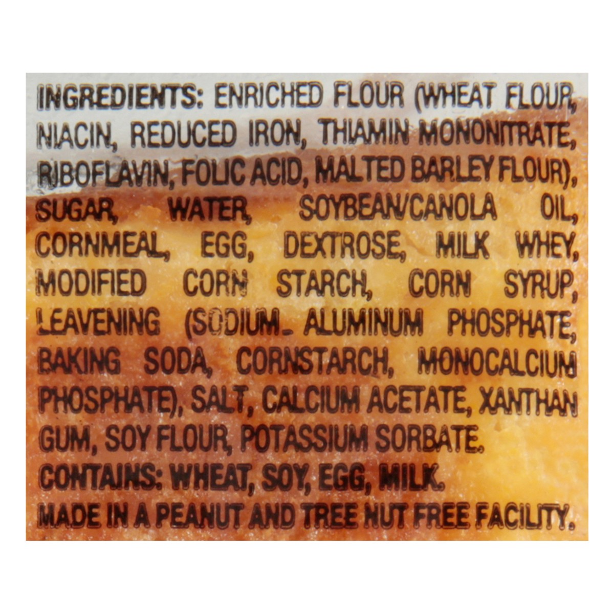 Enriched Flour (Wheat Flour Niacin, Reduced Iron, Thiamin Mononitrate, Riboflavin, Folic Acid, Malted Barley Flour), Sugar, Water, Soybean-Canola Oil, Cornmeal, Egg, Dextrose, Milk Whey, Modified Corn…