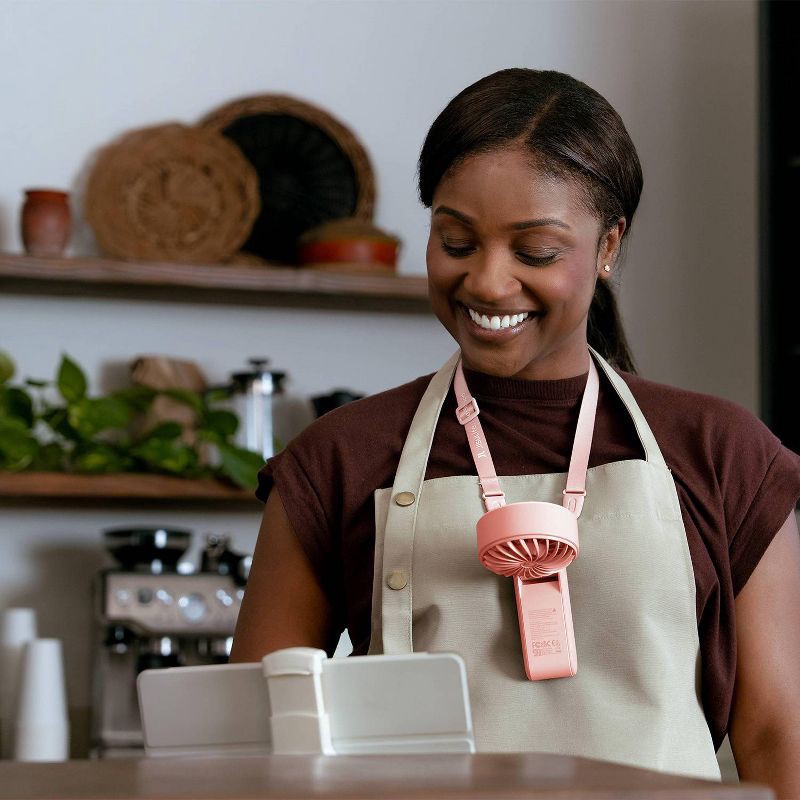 - Use as a handheld fan, a desktop cooler, or wear it around your neck—handle folds up to 150° for hands-free versatility.