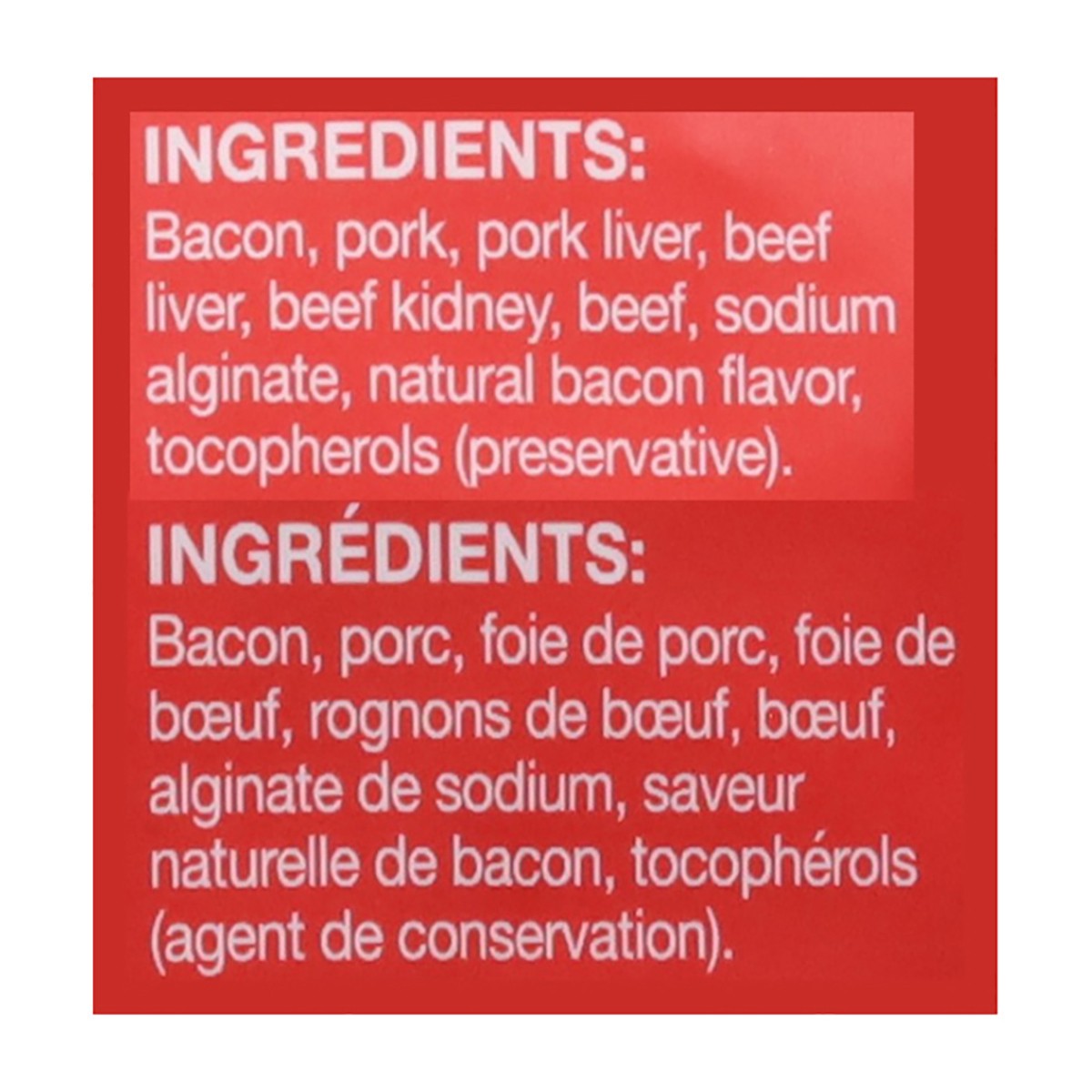 Bacon, Pork, Pork Liver, Beef Liver, Beef Kidney, Beef, Sodium Alginate, Natural Bacon Flavor, Tocopherols (Preservative).