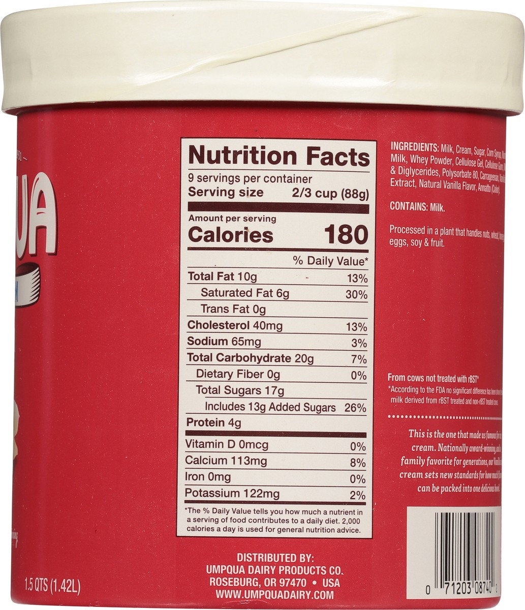 Milk, Cream, Sugar, Corn Syrup, Nonfat Milk, Whey Powder, Cellulose Gel, Cellulose Gum, Mono & Diglycerides, Polysorbate 80, Carrageenan, Vanilla Extract, Natural Vanilla Flavor, Annatto (Color).