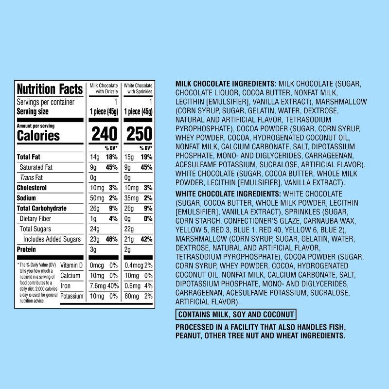 MILK CHOCOLATE INGREDIENTS: MILK CHOCOLATE (SUGAR, CHOCOLATE LIQUOR, COCOA BUTTER, NONFAT MILK, LECITHIN [EMULSIFIER], VANILLA EXTRACT), MARSHMALLOW (CORN SYRUP, SUGAR, GELATIN, WATER, DEXTROSE, NATUR…
