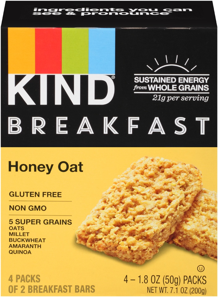 KIND Breakfast Honey Oat bars are a wholesome, healthy snack made with 100% whole grains for sustained energy. KIND Honey Oat breakfast bars are made with five super grains—oats, buckwheat, millet, am…