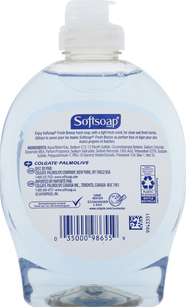 Enjoy Softsoap fresh breeze hand soap, with a light fresh cent, for clean and fresh hands. Dermatologist-tested. www.softsoap.com. www.soafsoap.ca. how2recycle.info. Save water. www.colgate.com/savewa…