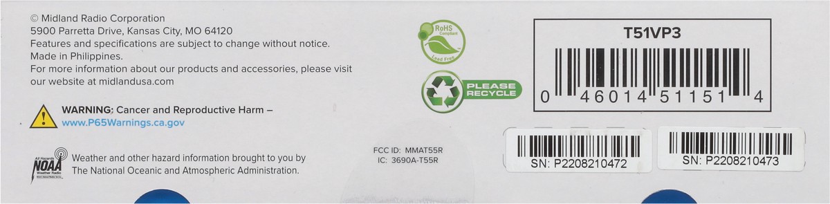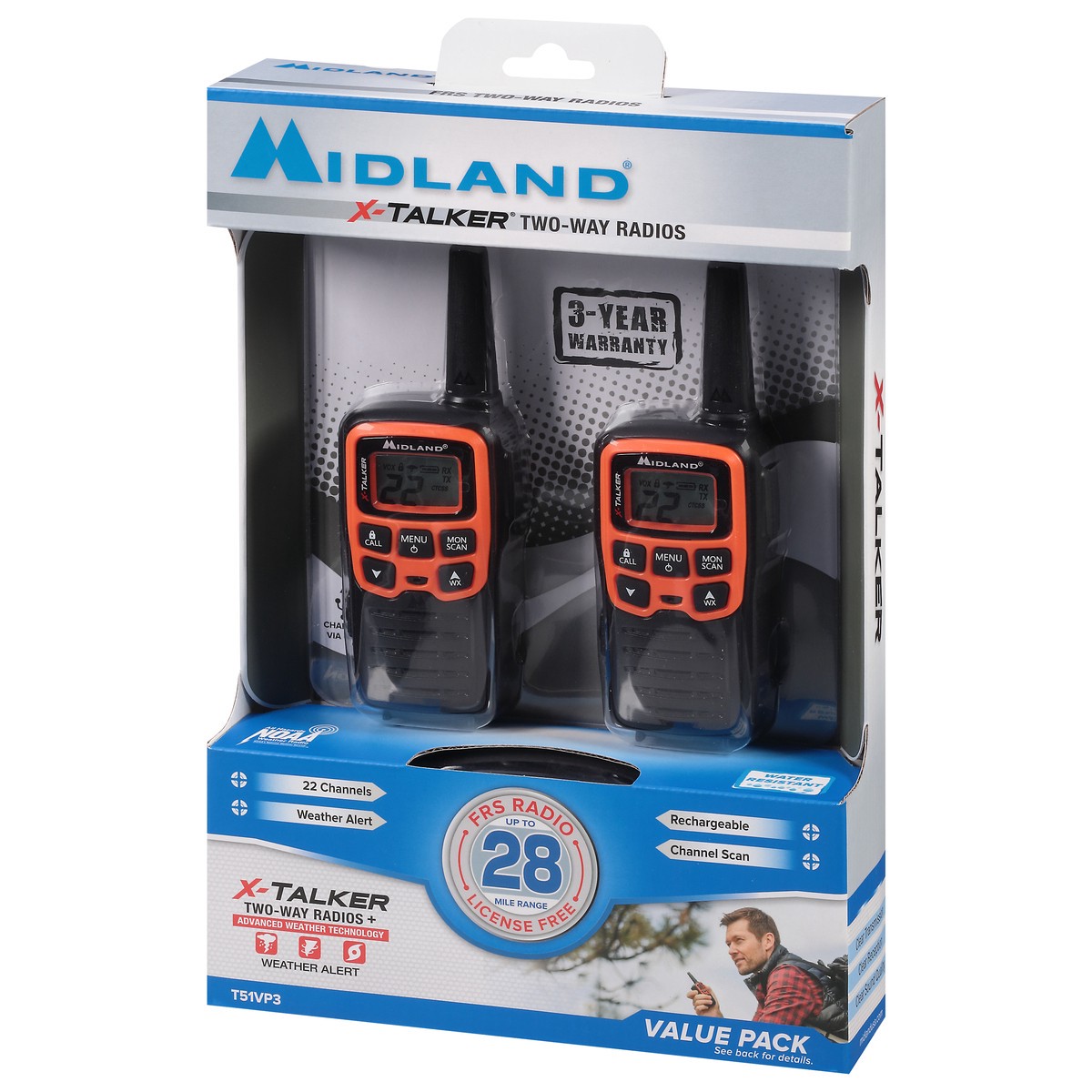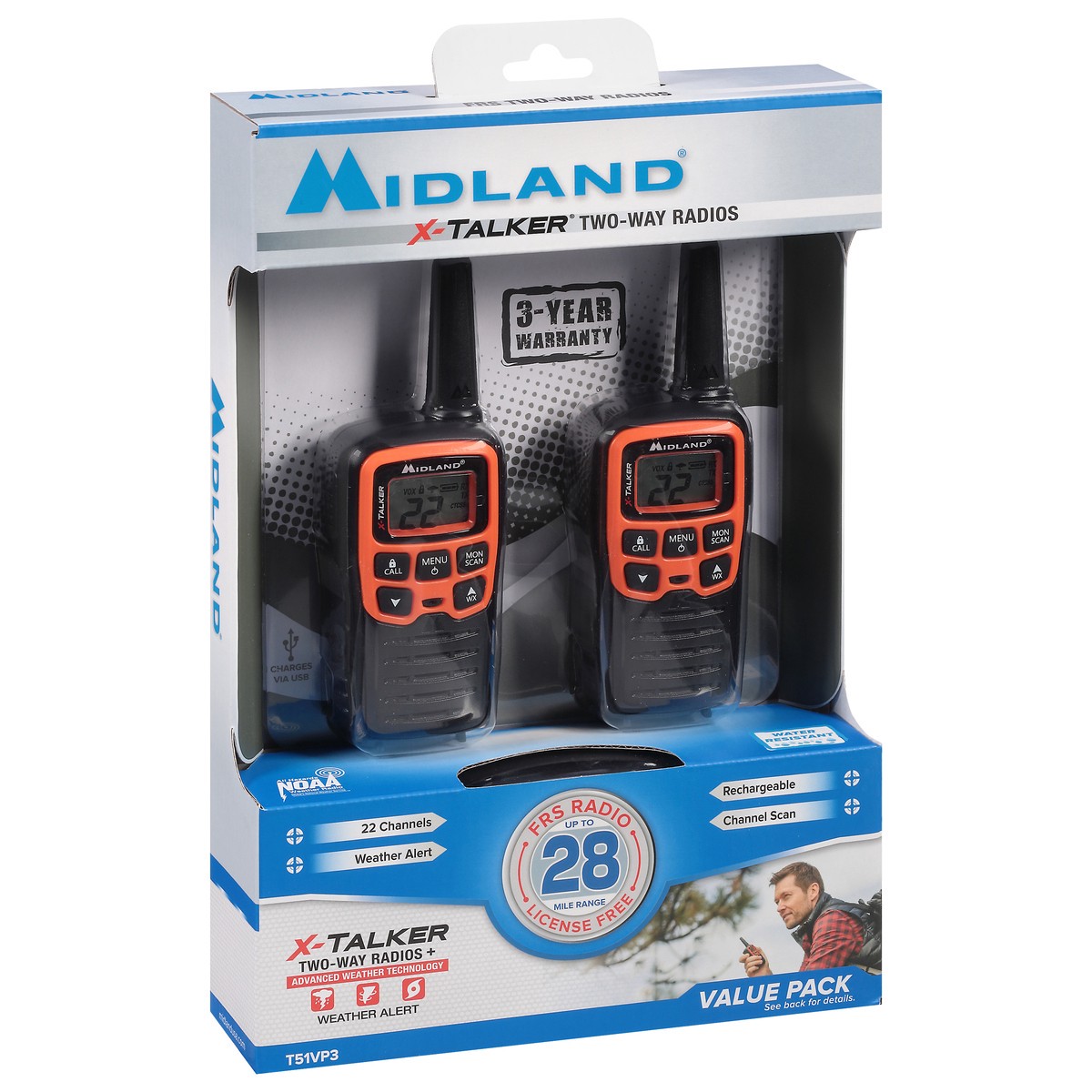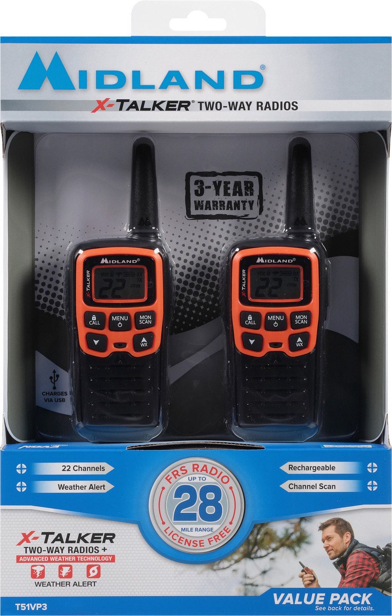 Charges via USB. 22 channels. Weather alert. Rechargeable. Channel scan. FRS Radio up to 28-mile range. License free. Value pack. See back for details. T51VP3 Features: 22 Channels + 38 Privacy codes.…