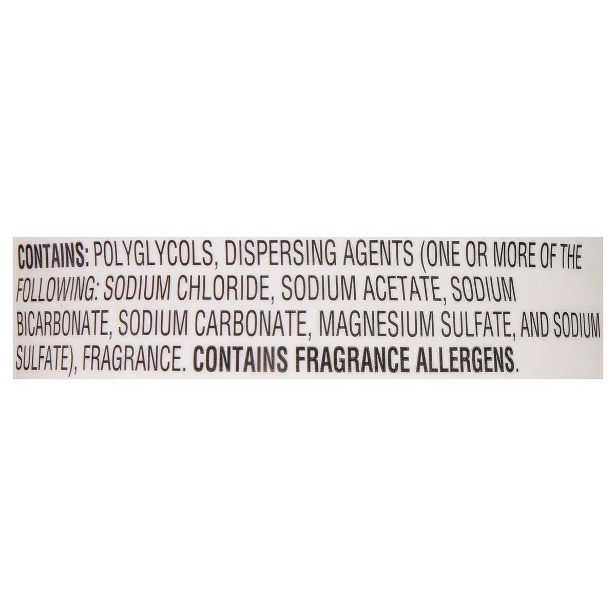Contains: Polyglycols, Dispersing Agents (One or More of the Following: Sodium Chloride, Sodium Acetate, Sodium Bicarbonate, Sodium Carbonate, Magnesium Sulfate, and Sodium Sulfate), Fragrance.