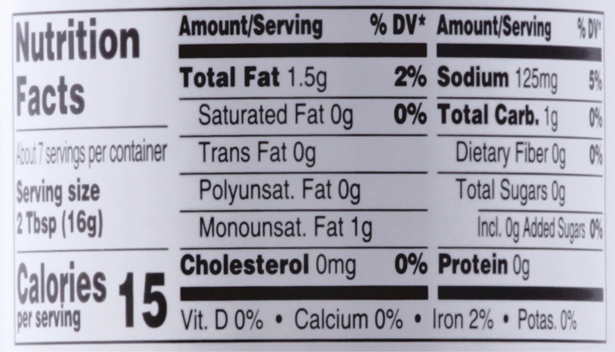 15 calories per 2 tbsp. Gluten free. Cholesterol free. Perfect on a pizza. harristeeter.com. 1-800-432-6111 or harristeeter.com. Together in Education. Non BPA liner (This packaged was produced withou…