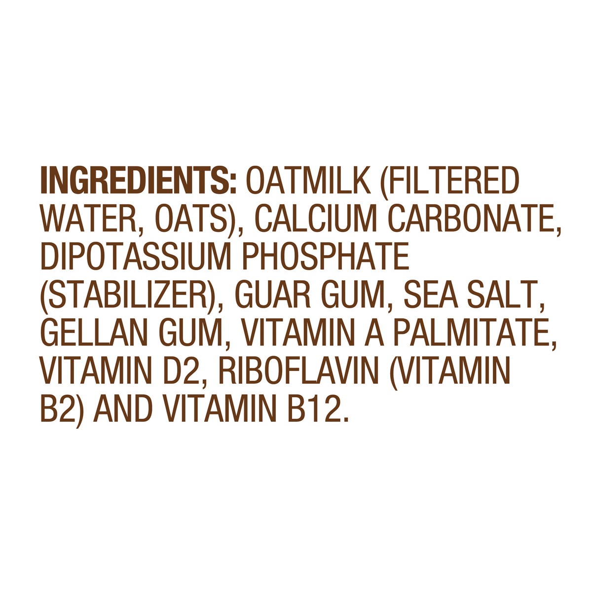 Oatmilk (Filtered Water, Oats), Calcium Carbonate, Dipotassium Phosphate (Stabilizer), Guar Gum, Sea Salt, Gellan Gum, Vitamin A Palmitate, Vitamin D2, Riboflavin (Vitamin B2) and Vitamin B12.