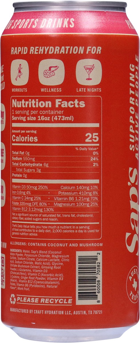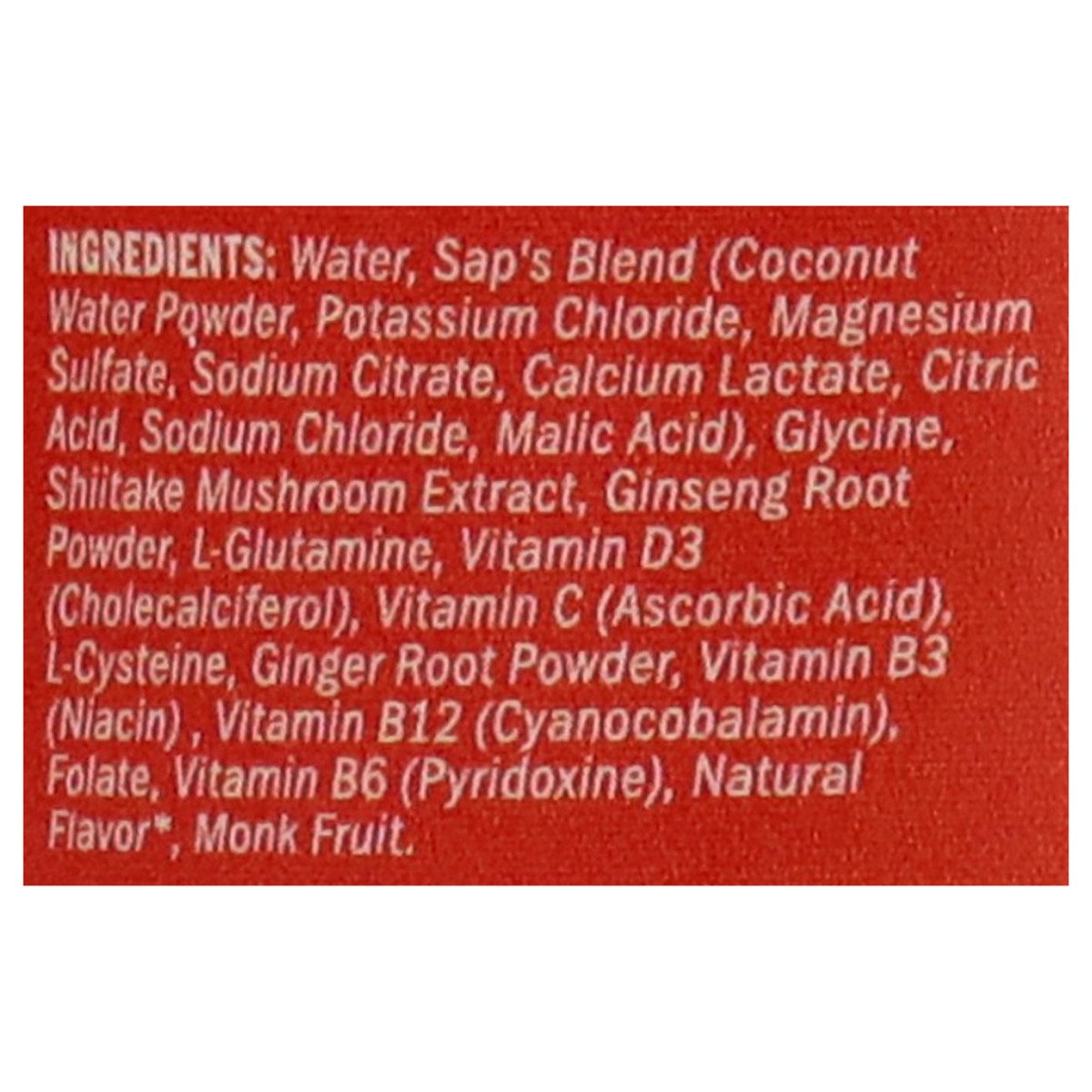 Water, Sap''s Blend (Coconut Water Powder, Potassium Chloride, Magnesium Sulfate, Sodium Citrate, Calcium Lactate, Citric Acid, Sodium Chloride, Malic Acid), Glycine, Shiitake Mushroom Extract, Ginsen…