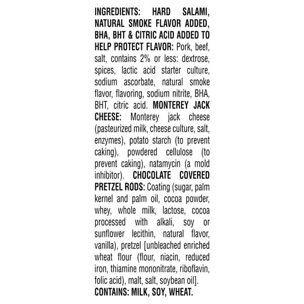 HARD SALAMI, NATURAL SMOKE FLAVOR ADDED, BHA, BHT & CITRIC ACID ADDED TO HELP PROTECT FLAVOR: Pork, beef, salt, contains 2% or less: dextrose, spices, lactic acid starter culture, sodium ascorbateā¦