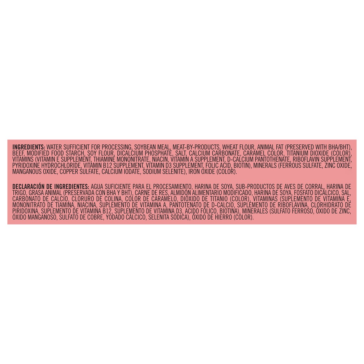 Water Sufficient for Processing, Soybean Meal, Meat-By-Products, Wheat Flour, Animal Fat (Preserved with BHA/BHT), Beef, Modified Food Starch, Soy Flour, Dicalcium Phosphate, Salt, Calcium Carbonate, …