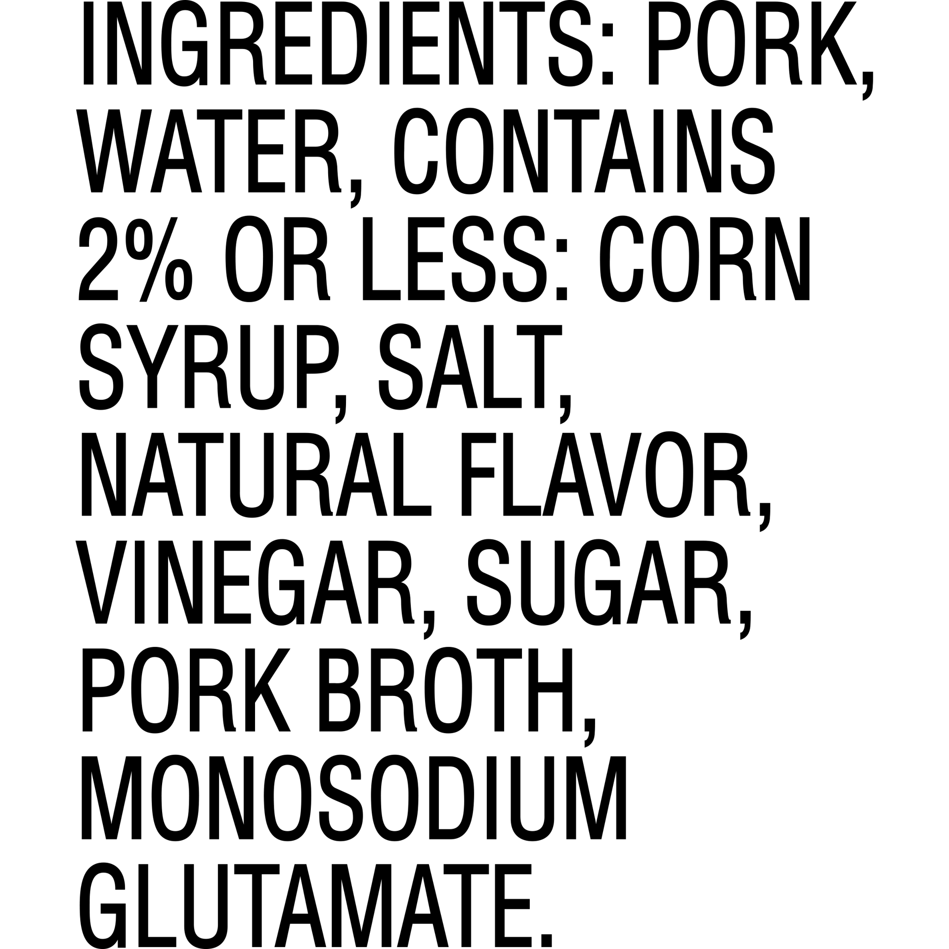 Pork, Water, Contains 2% Or Less: Corn Syrup, Salt, Natural Flavor, Vinegar, Sugar, Pork Broth, Monosodium Glutamate.