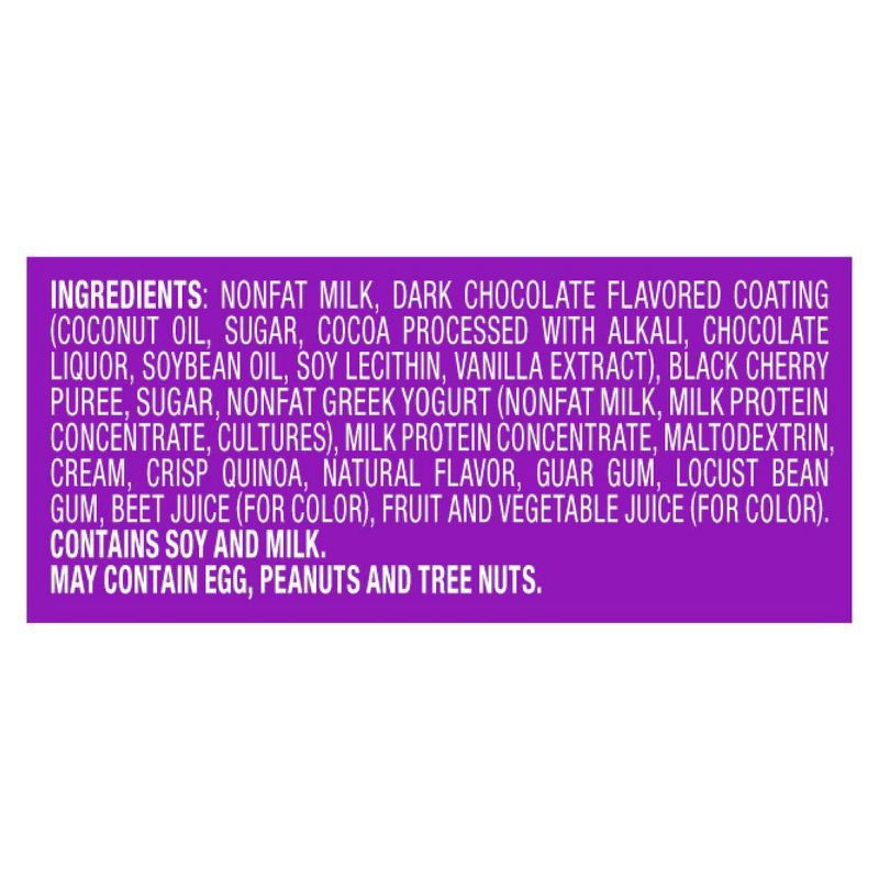 Nonfat Milk, Dark Chocolate Flavored Coating (Coconut Oil, Sugar, Cocoa Processed with Alkali, Chocolate Liquor, Soybean Oil, Soy Lecithin, Vanilla Extract), Black Cherry Puree, Sugar, Nonfat Greek Yo…