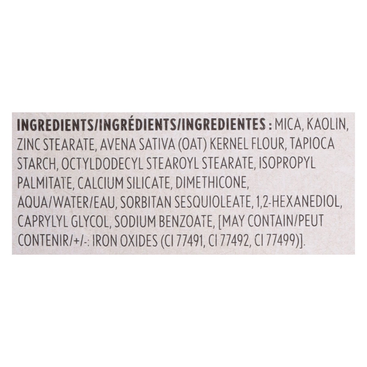 Mica, Kaolin, Zinc Stearate, Avena Sativa (Oat) Kernel Flour, Tapioca Starch, Octyldodecyl Stearoyl Stearate, Isopropyl Palmitate, Calcium Silicate, Dimethicone, Aqua/Water/Eau, Sorbitan Sesquioleate,…