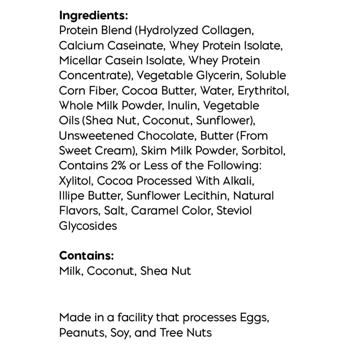 Protein Blend (Hydrolyzed Collagen, Calcium Caseinate, Whey Protein Isolate, Micellar Casein Isolate, Whey Protein Concentrate), Vegetable Glycerin, Soluble Corn Fiber, Cocoa Butter, Water, Erythritol…