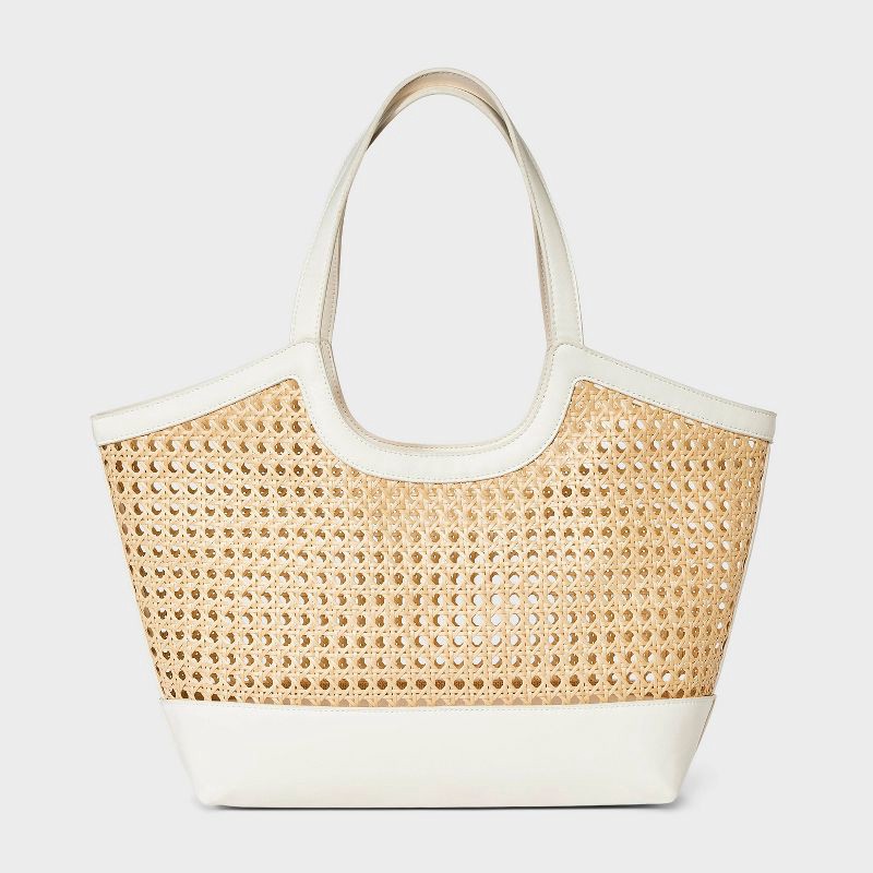 Bring fresh, tropical vibes to your look with this Straw Caning Tote Bag from A New Day™. Featuring a polyethylene shell, this tote bag features cane design in a natural hue with white trim, making it…