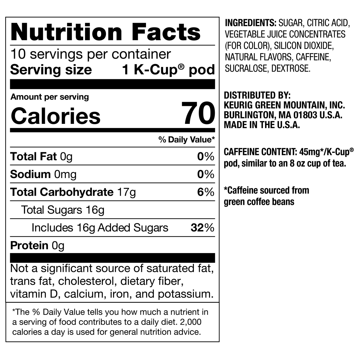 INGREDIENTS: SUGAR, MALTODEXTRIN, CITRIC ACID, NATURAL FLAVORS, ACACIA GUM, MALIC ACID, INCIDENTAL, CAFFEINE, SUCRALOSE, INCIDENTAL, PURPLE SWEET POTATO CONCENTRATE (COLOR), INCIDENTAL , DL-ALPHA-TOCO…