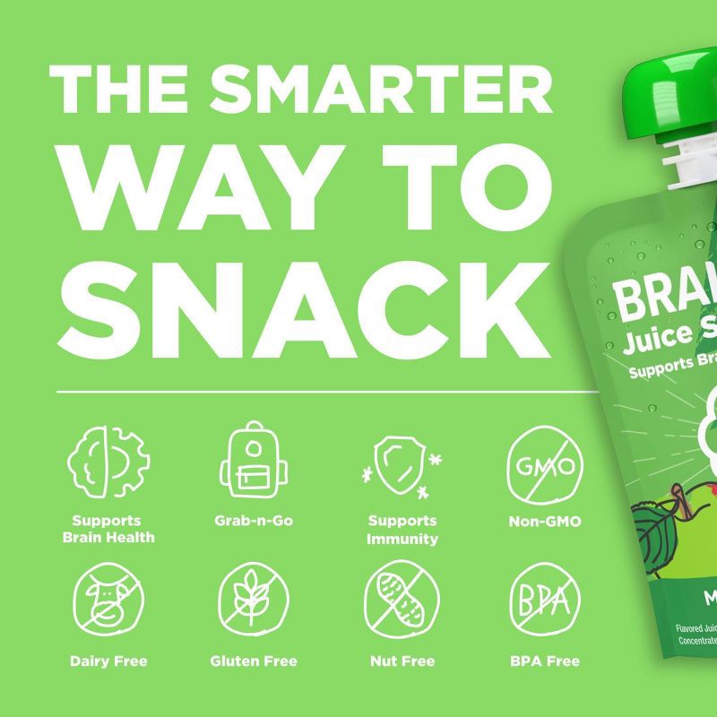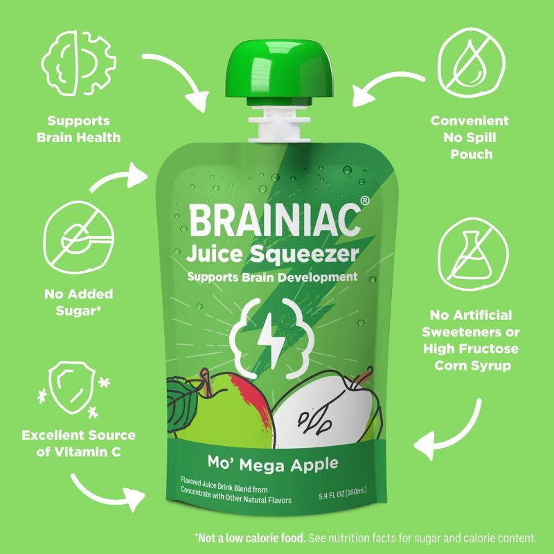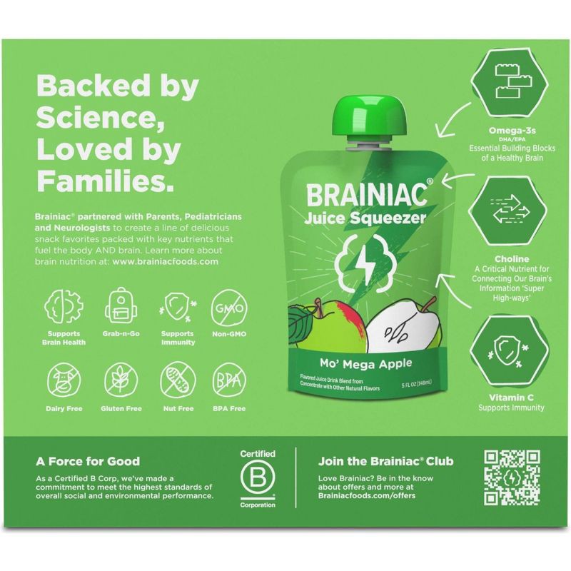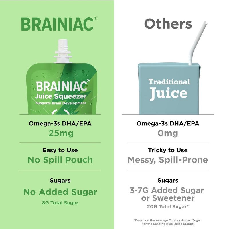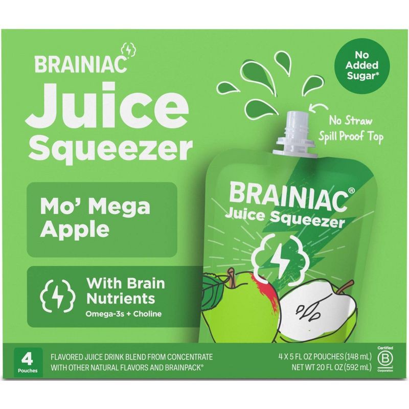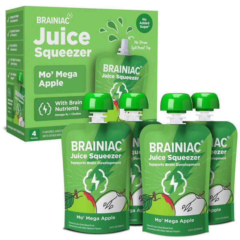 - DEVELOPED WITH EXPERTS: At Brainiac we work with leading Pediatricians, Neurologists and Nutritionists to ensure we're making products that include the key nutrients growing minds need. Brainiac Juice Squeezer are the first kids' juice to include Omega-3s and Choline - the key building blocks for healthy brain development. Each of our pouches is also an excellent source of Vitamin C.