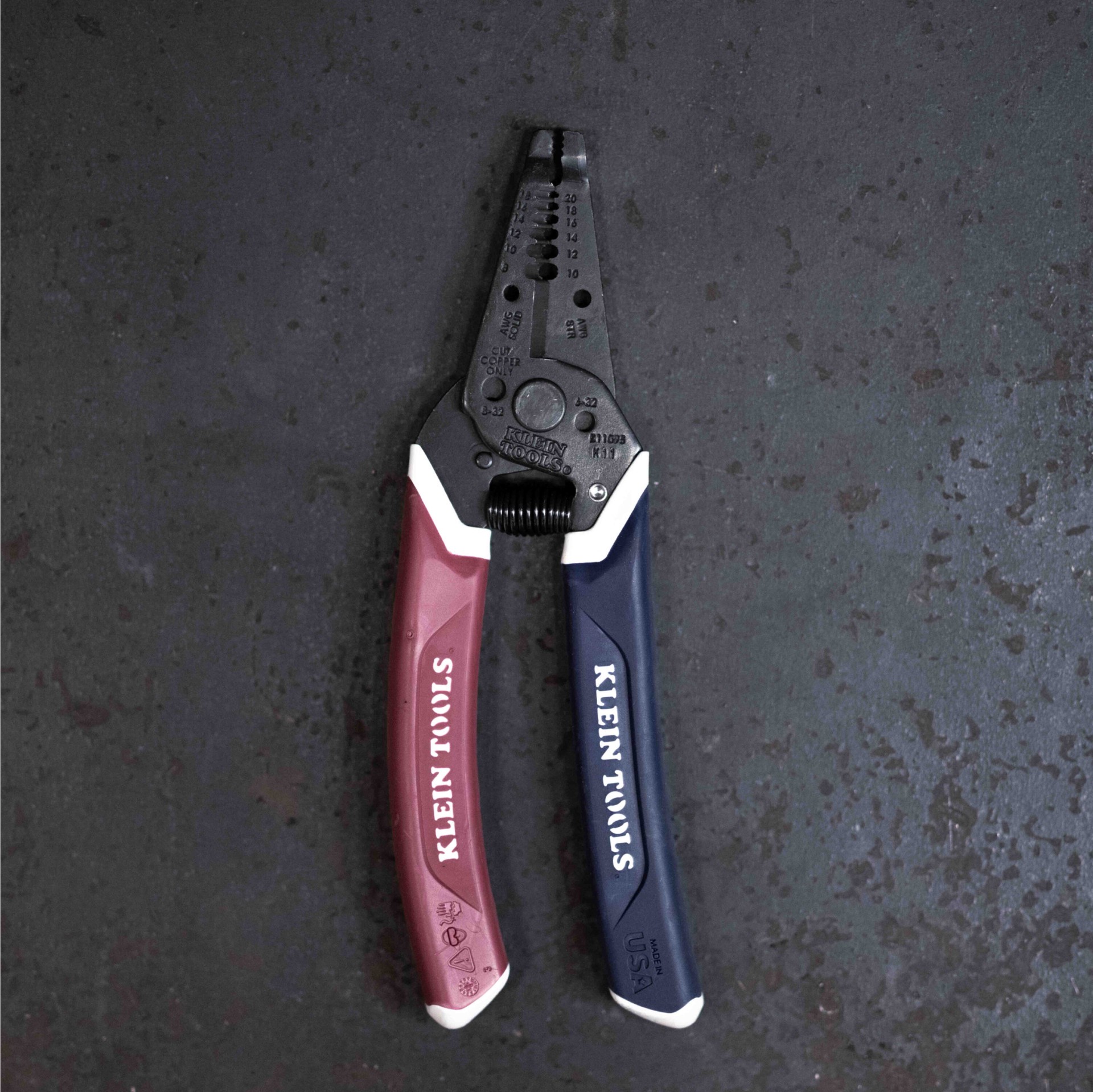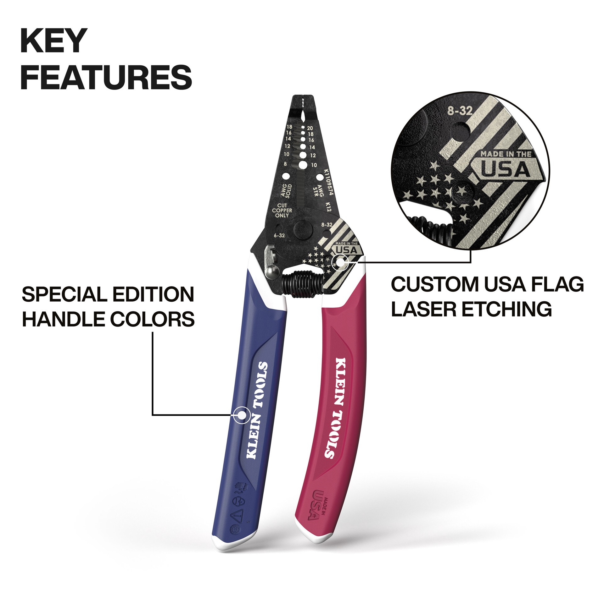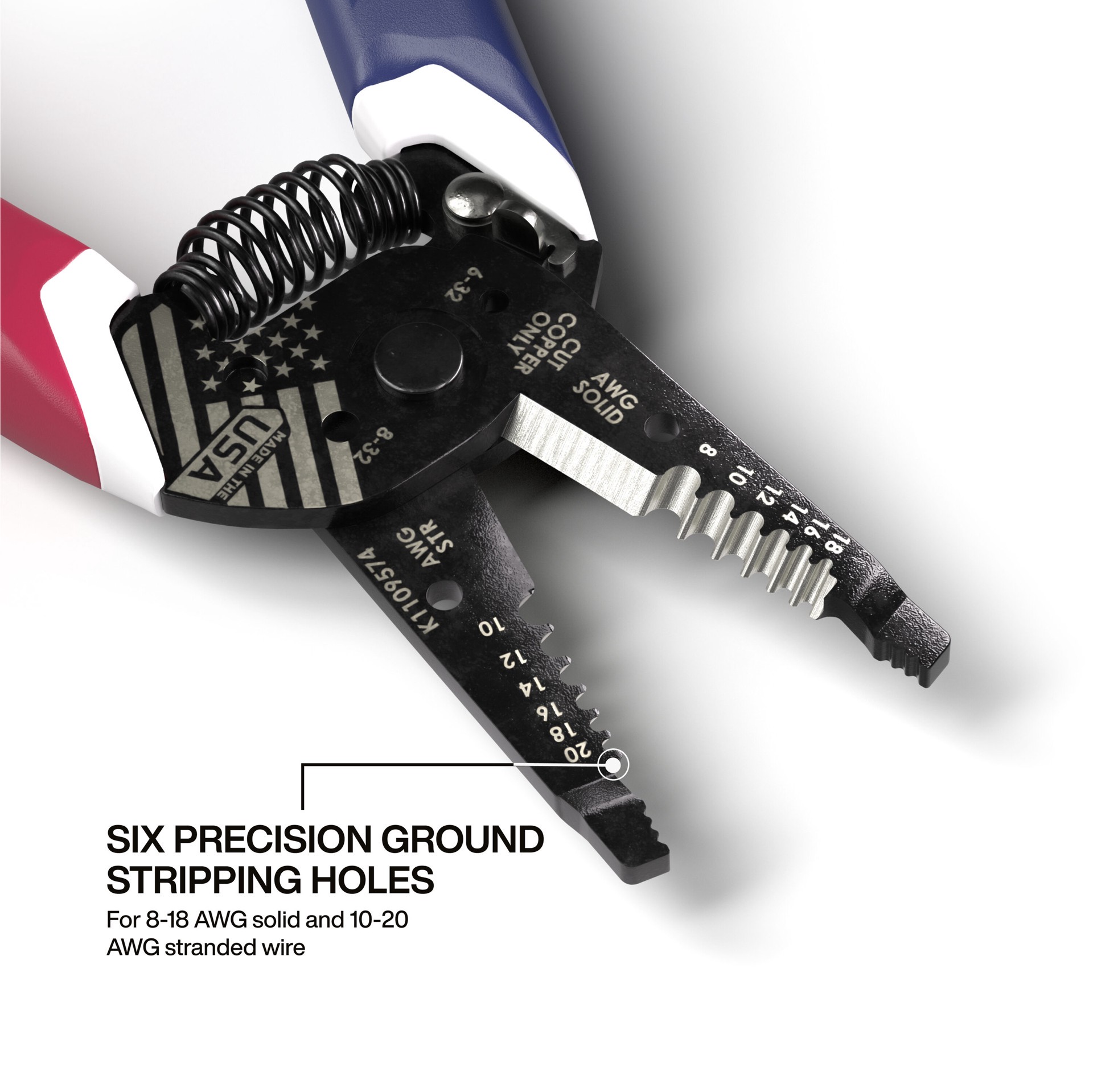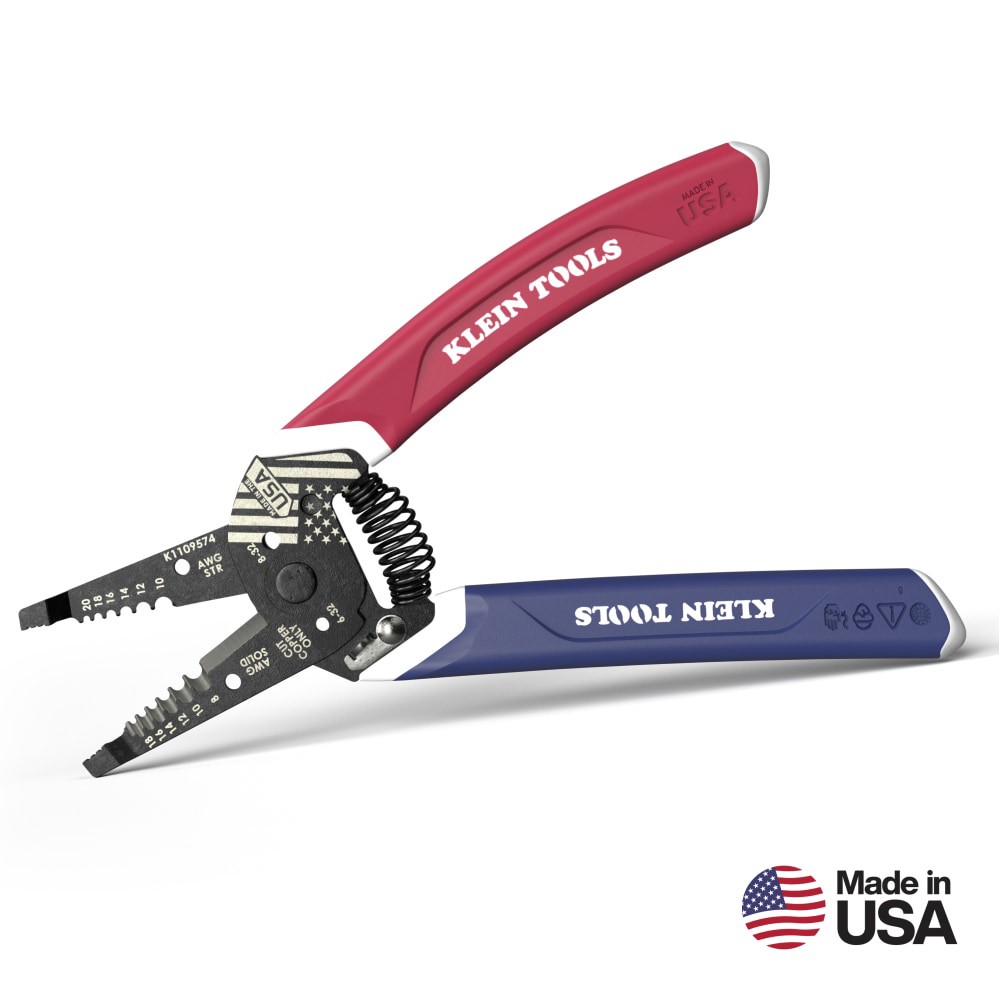 Featuring unique red, white and blue Klein-Kurve comfort grip handles. Made in the USA with custom USA flag laser etching. Six precision ground stripping holes for 8-18 AWG Solid and 10-20 AWG Strandeā¦