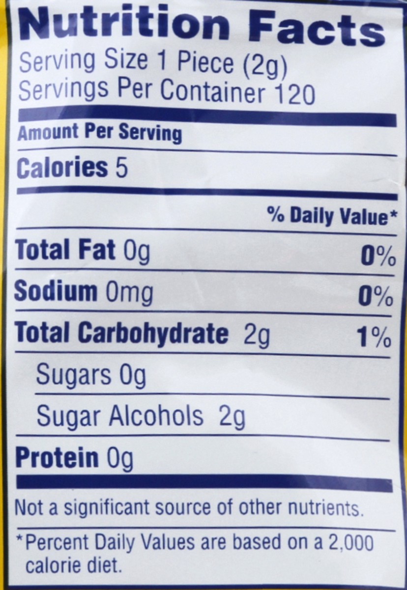 Artificially flavored. 30% fewer calories than sugared gum. Calories content of this size pieces has been reduced from 7 to 5 calories per serving. Produced with genetic engineering. New gum! Buy 120 …