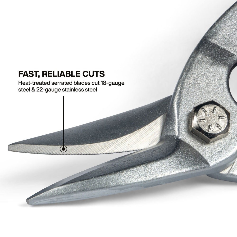 Aviation Snips 3-Pack includes left cutting snips (Cat No 1200L), right cutting snips (Cat No 1201R) and straight cutting snips (Cat No 1202S). Serrated blades of forged steel for superior strength an…