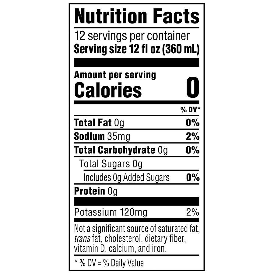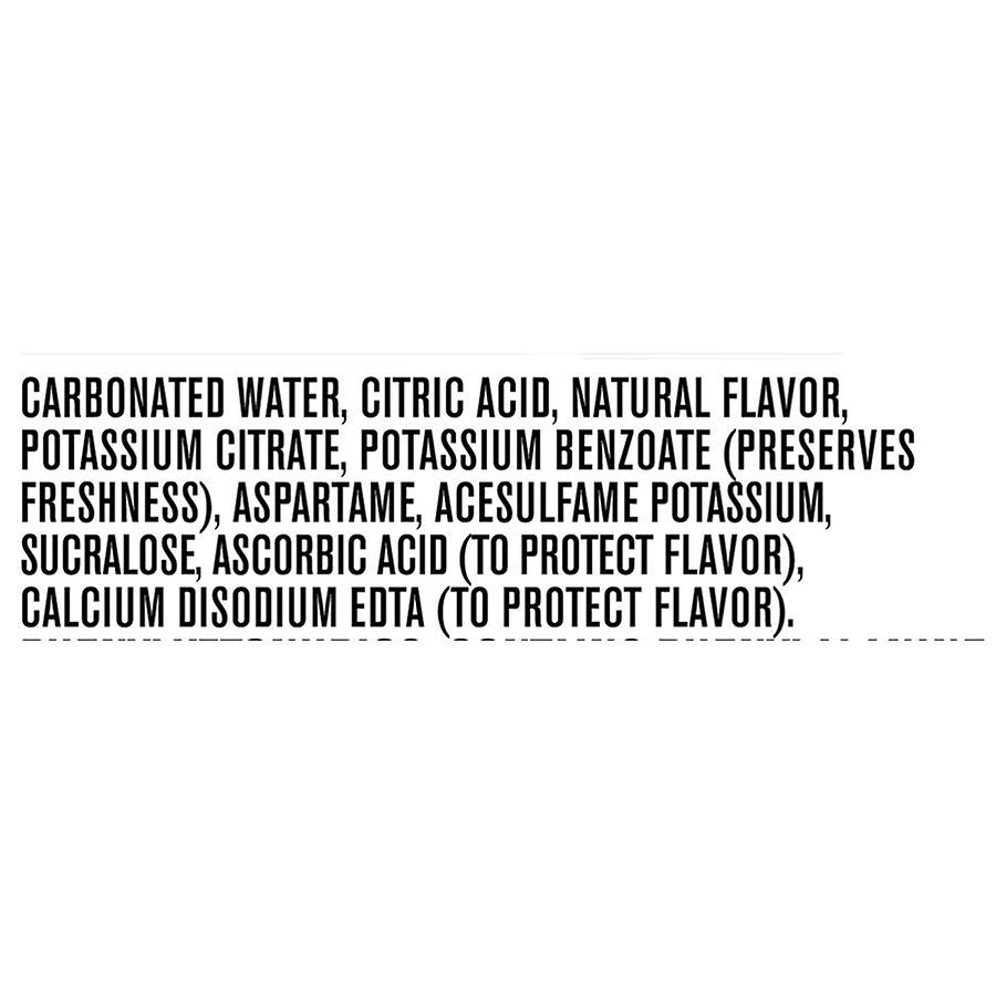 Carbonated Water, Citric Acid, Natural Flavor, Potassium Citrate, Potassium Benzoate (Preserves Freshness), Aspartame, Acesulfame Potassium, Sucralose, Ascorbic Acid (to Protect Flavor), Calcium Disod…