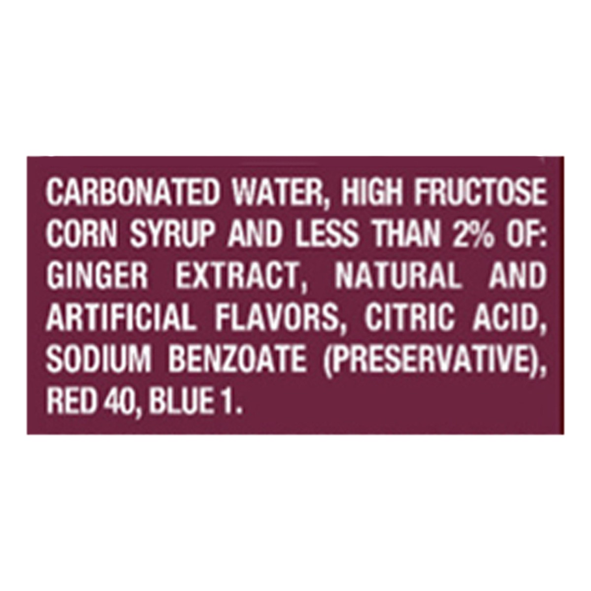 Carbonated Water, High Fructose Corn Syrup and Less than 2% of: Ginger Extract, Natural and Artificial Flavors, Citric Acid, Sodium Benzoate (Preservative), Red 40, Blue 1.