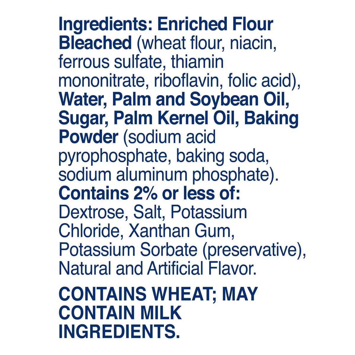 Enriched Flour Bleached (Wheat Flour, Niacin, Ferrous Sulfate, Thiamin Mononitrate, Riboflavin, Folic Acid), Water, Palm and Soybean Oil, Sugar, Palm Kernel Oil, Baking Powder (Sodium Acid Pyrophospha…