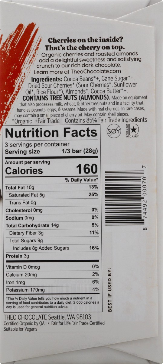 Theo Chocolate Organic Cherry & Almond Dark Chocolate Bar - 3 oz