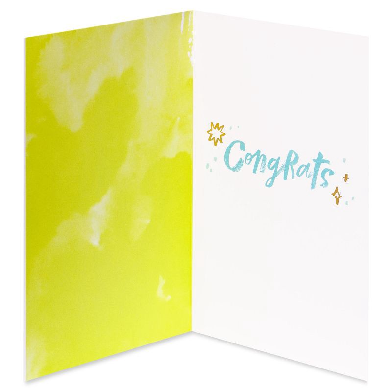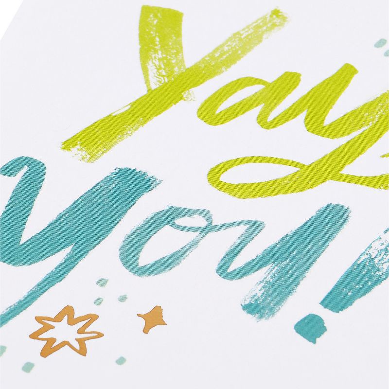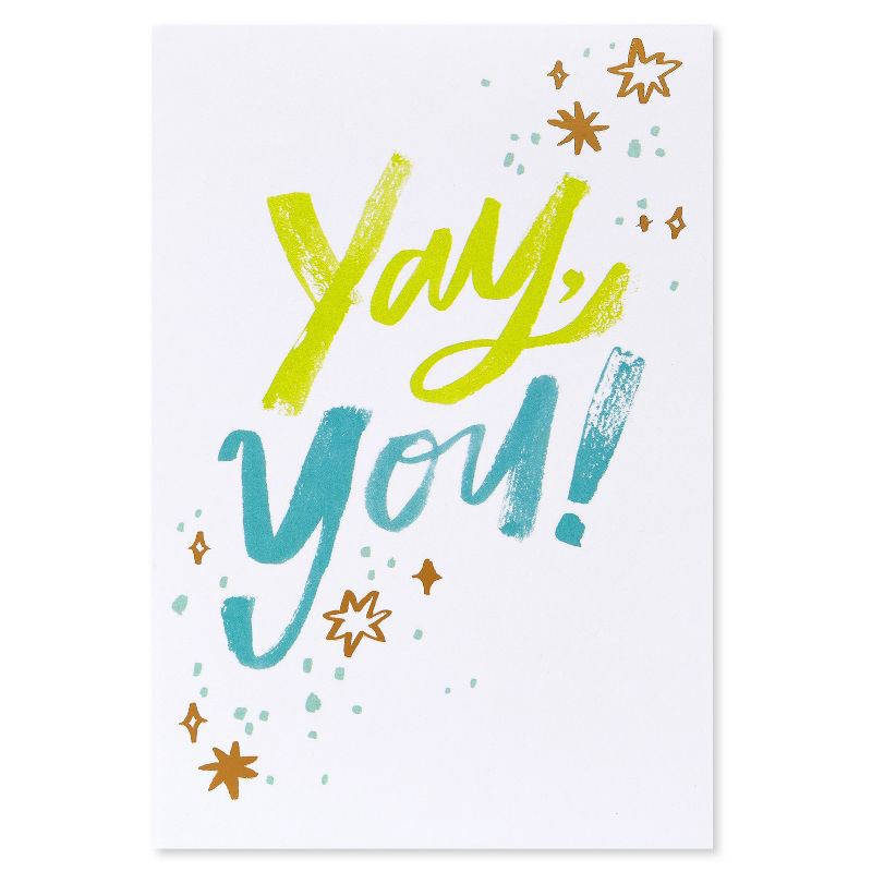Celebrate something amazing with a congrats card! This fun and fresh design features the words “Yay, You!” in green and teal lettering, with metallic gold foil accents to add some sparkle. Inside, a s…