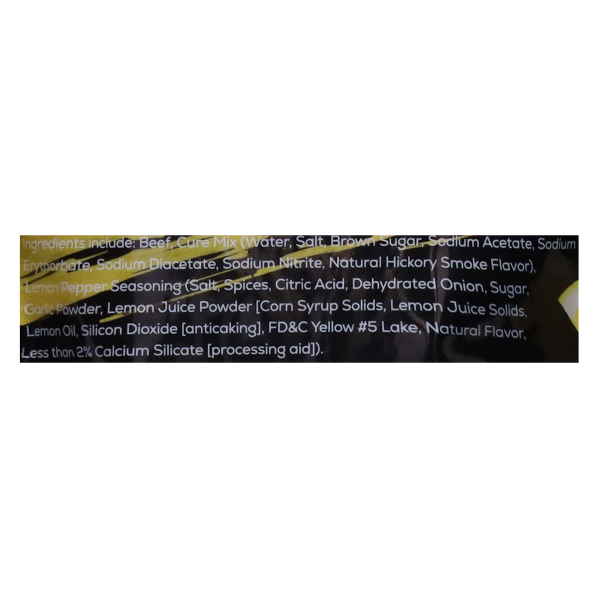 Ingredients Include: Beef, Cure Mix (Water, Salt, Brown Sugar, Sodium Acetate, Sodium Erythorbate, Sodium Diacetate, Sodium Nitrite, Natural Hickory Smoke Flavor), Lemon Pepper Seasoning (Salt, Spices…