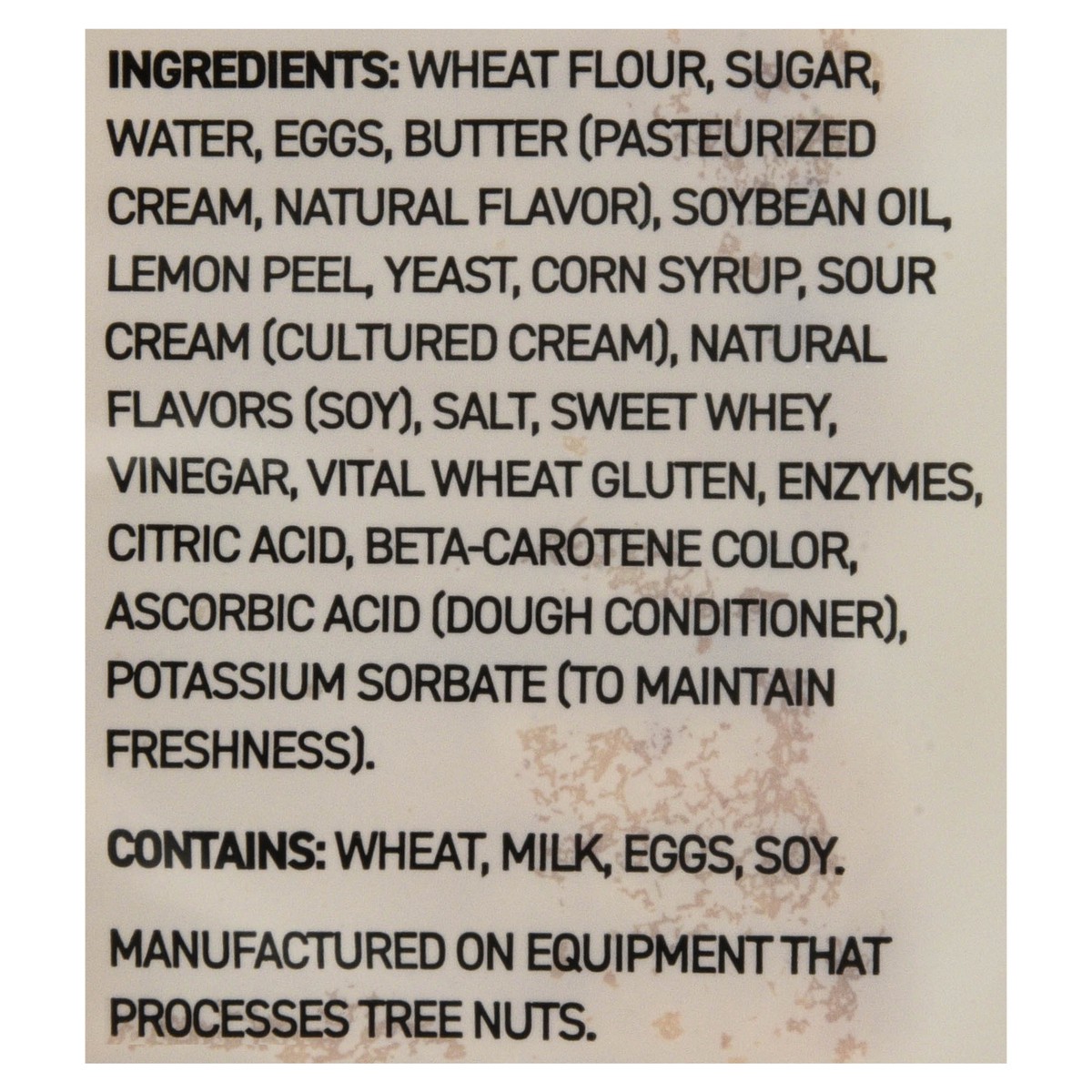 Wheat Flour, Sugar, Water, Eggs, Butter (Pasteurized Cream, Natural Flavor), Soybean Oil, Lemon Peel, Yeast, Corn Syrup, Sour Cream (Cultured Cream), Natural Flavors (Soy), Salt, Sweet Whey, Vinegar, …