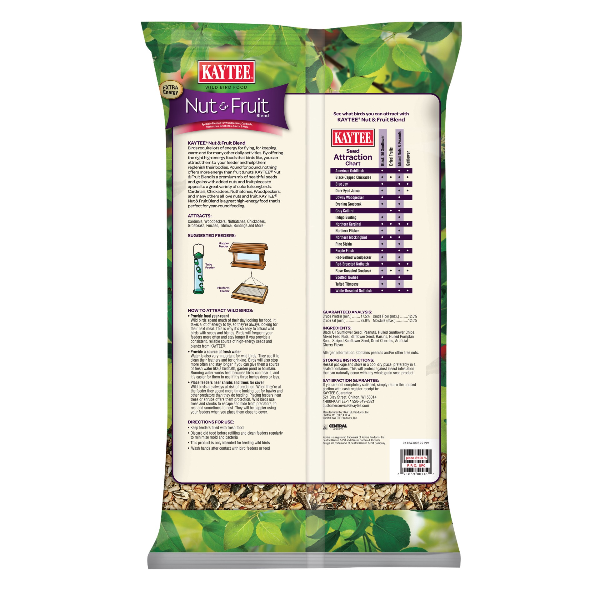 Wild birds require a lot of energy for flying. Offer them the Kaytee Nut & Fruit Blend to keep them fueled and happy. Pound for pound, nothing offers your feathered friend more energy than fruit and n…