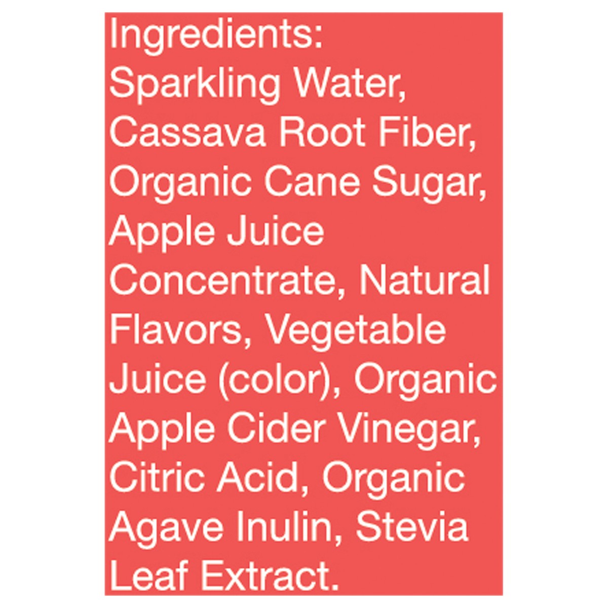 Sparkling Water, Cassava Root Fiber, Organic Cane Sugar, Apple Juice Concentrate, Natural Flavors, Vegetable Juice (Color), Organic Apple Cider Vinegar, Citric Acid, Organic Agave Inulin, Stevia Leaf …