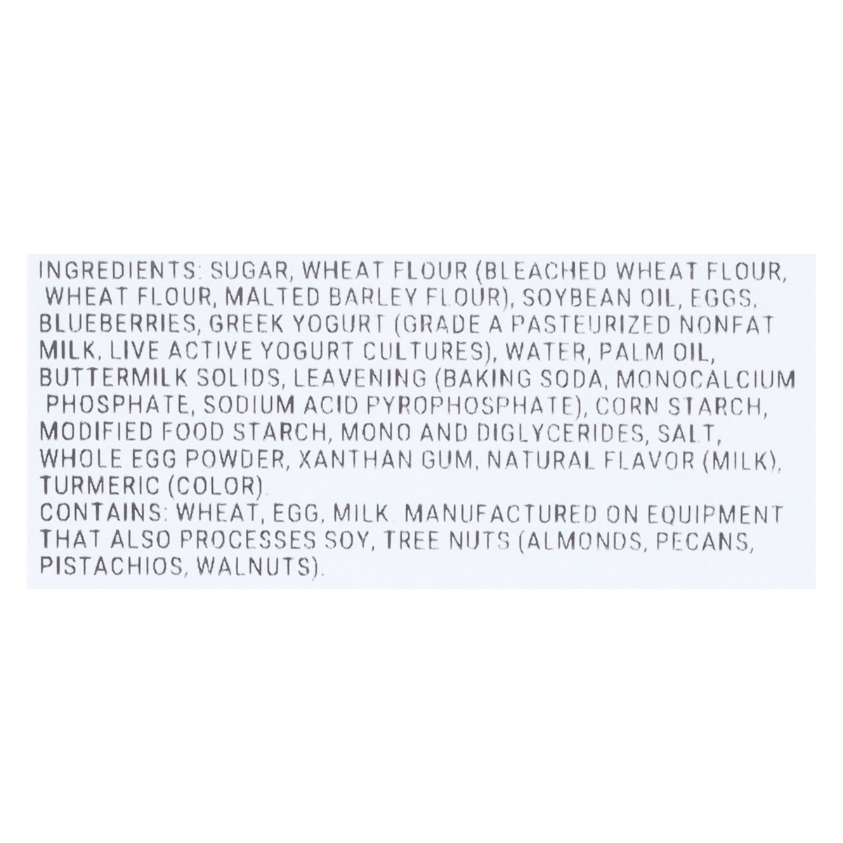 Sugar, Wheat Flour (Bleached Wheat Flour, Wheat Flour, Malted Barley Flour), Soybean Oil, Eggs, Blueberries, Greek Yogurt (Grade A Pasteurized Nonfat Milk, Live Active Yogurt Cultures), Water, Palm Oi…