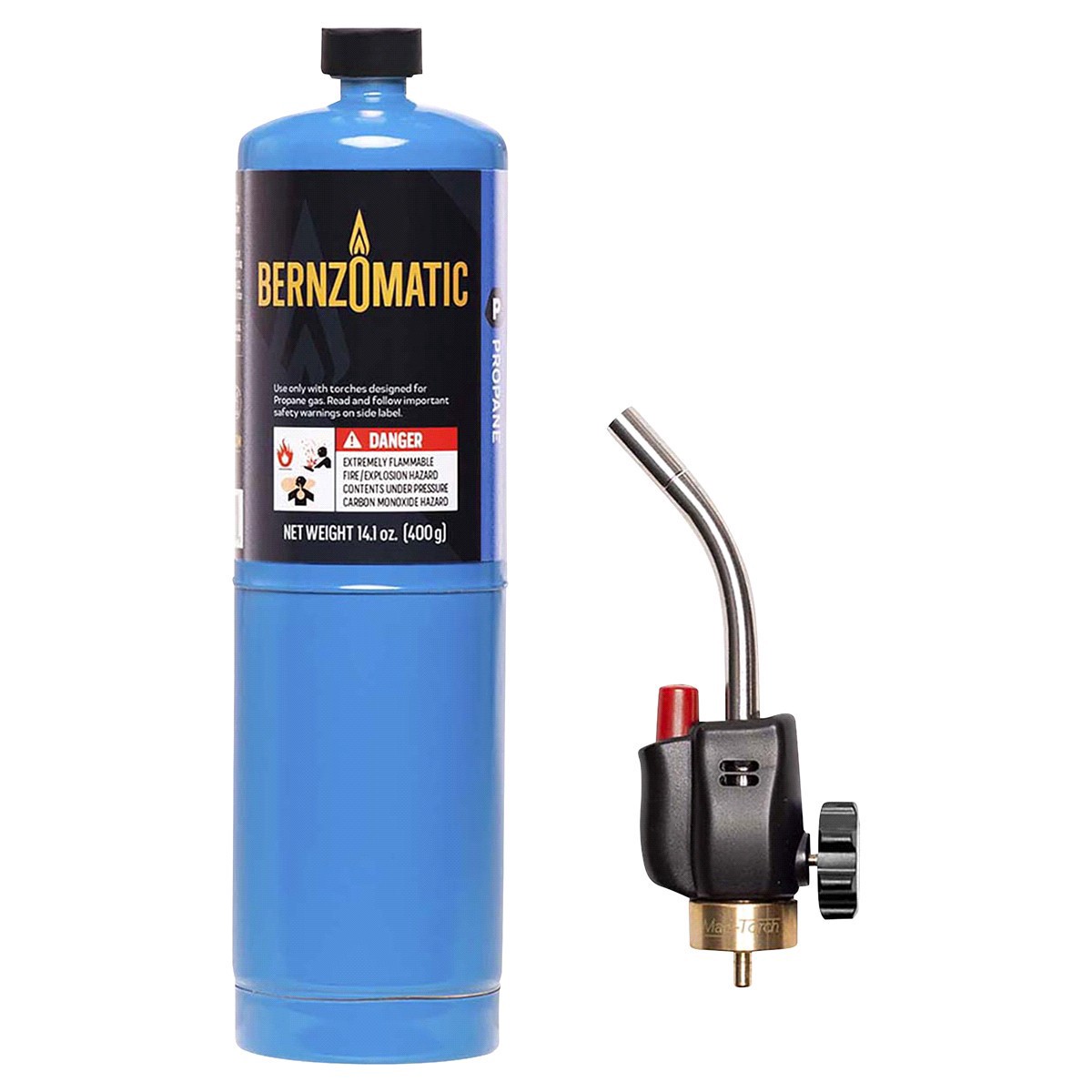 This self lighting torch kit includes the torch and a 14.1 oz propane cylinder. Torch has a trigger start ignition and an adjustable webbed flame.