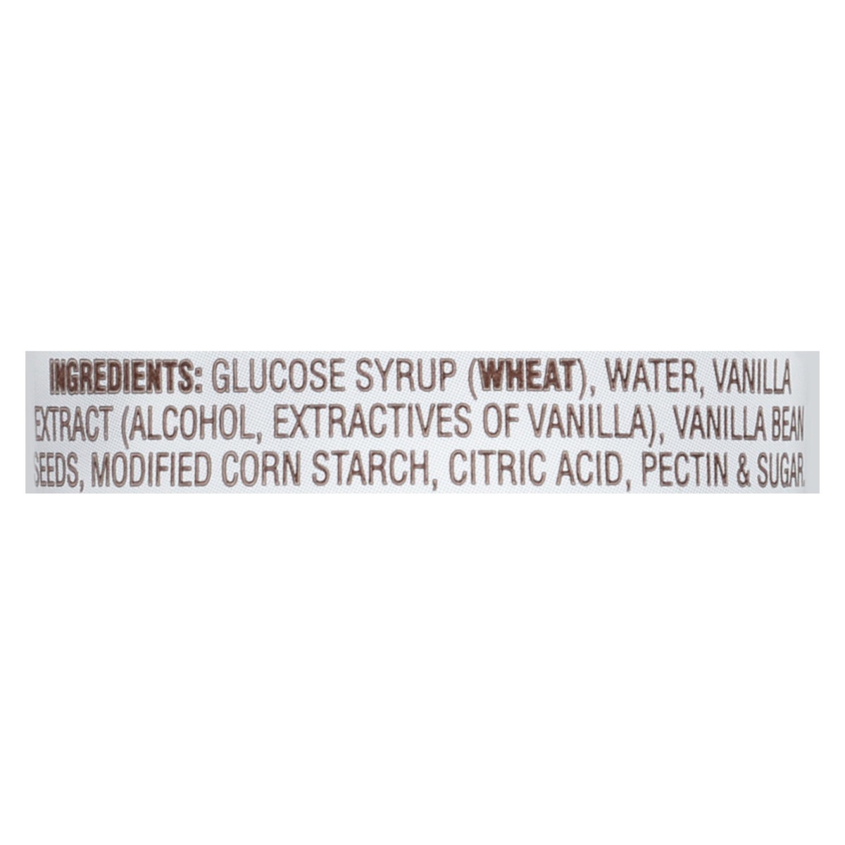 Glucose Syrup (Wheat), Water, Vanilla Extract (Alcohol, Extractives of Vanilla), Vanilla Bean Seeds, Modified Corn Starch, Citric Acid, Pectin & Sugar.