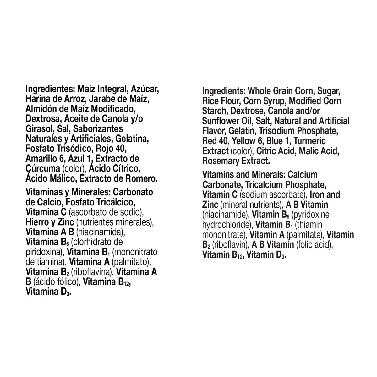 Whole Grain Corn, Sugar, Rice Flour, Corn Syrup, Modified Corn Starch, Dextrose, Canola and/or Sunflower Oil, Salt, Natural and Artificial Flavor, Gelatin, Trisodium Phosphate, Red 40, Yellow 6, Blue …
