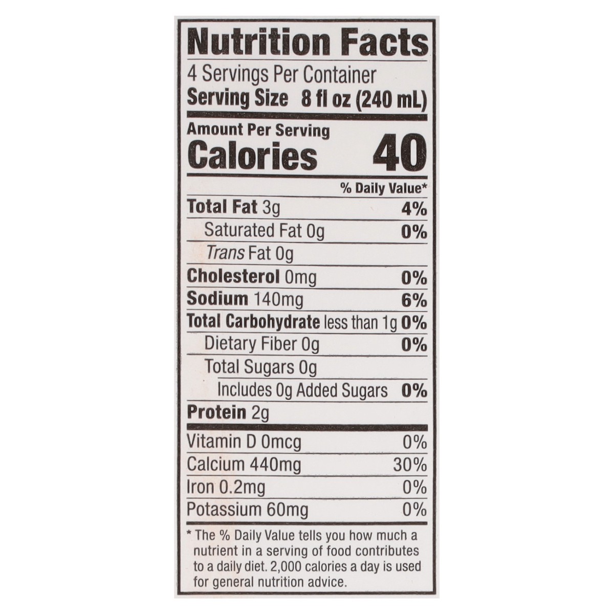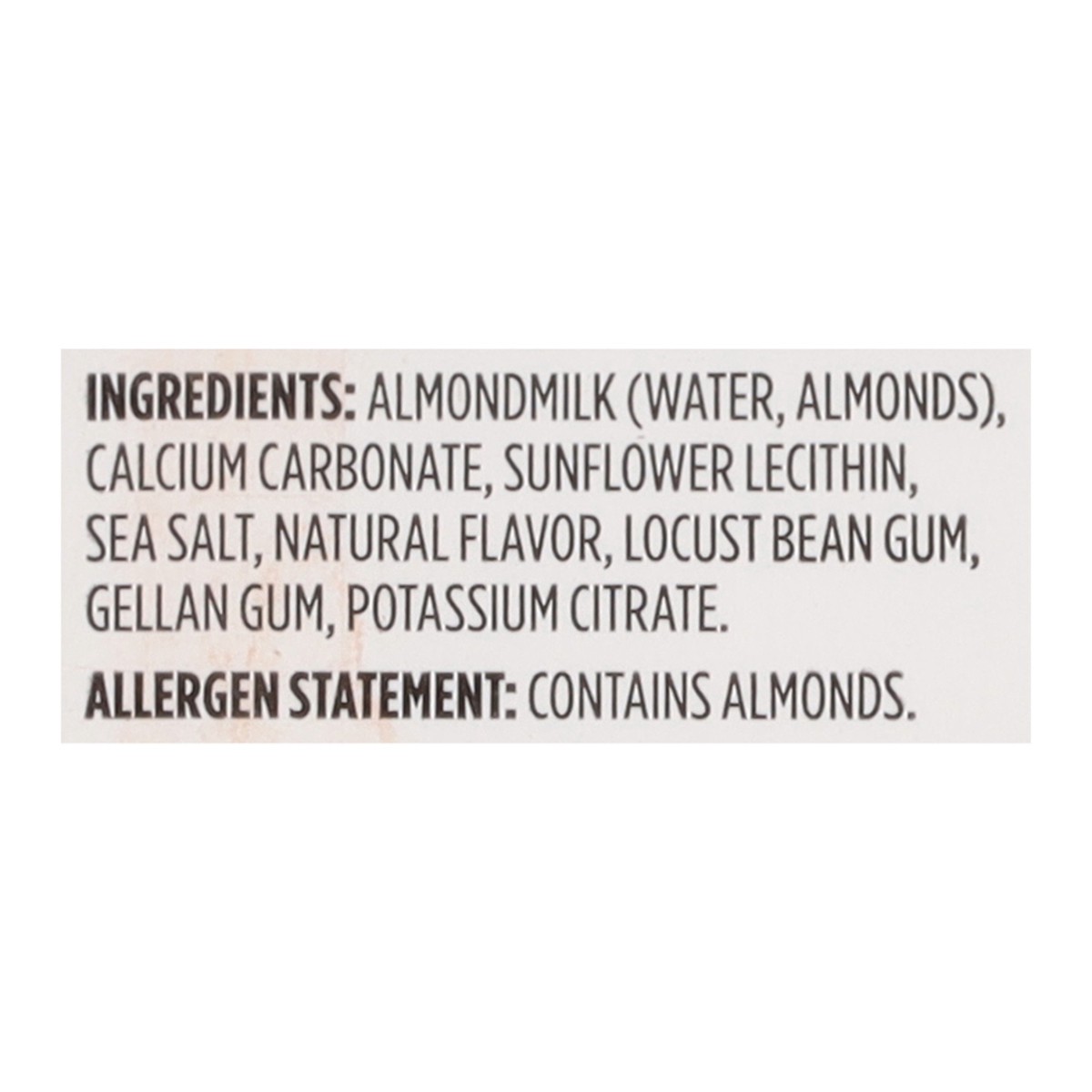Almondmilk (Water, Almonds), Calcium Carbonate, Sunflower Lecithin, Sea Salt, Natural Flavor, Locust Bean Gum, Gellan Gum, Potassium Citrate.