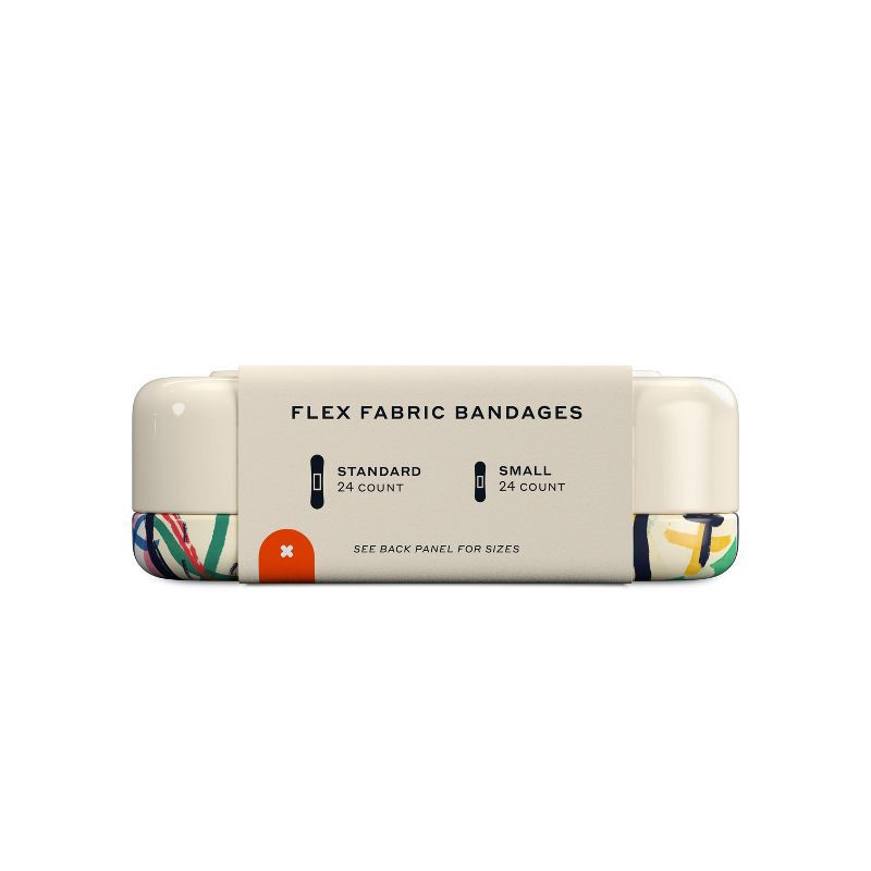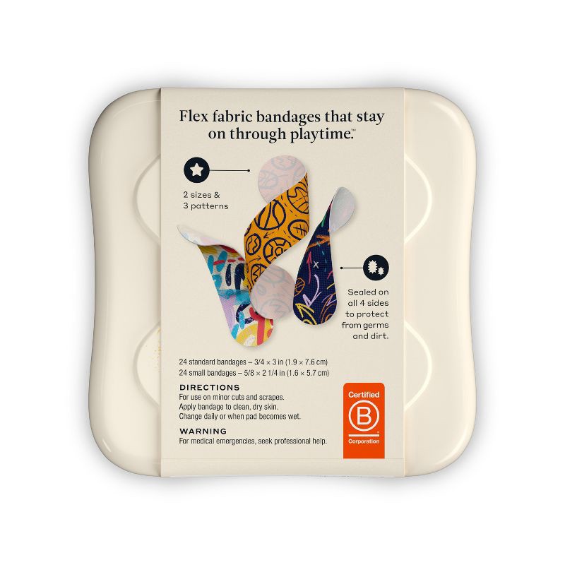- 48-count flex fabric bandages that stay on through playtime; 2 kid-friendly bandage sizes