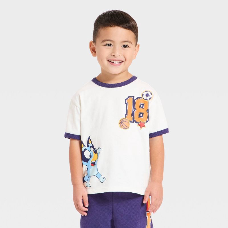- White tee features Bluey graphic with basketball, soccer ball and number 18