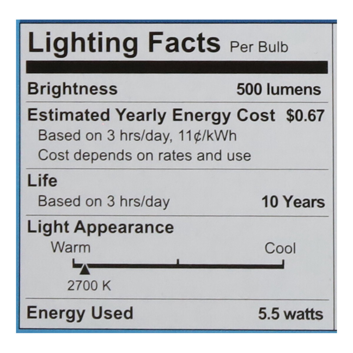 Model Number: 9290030840 Brightness Quantity: 500 lumens. Energy Info: $0.67 Based on 3 hrs/day, 11 cents/kWh. Cost depends on rates and use. 5.5 watts. Package Info: 3. Bulb Info: LED. Is Dimmable. S…