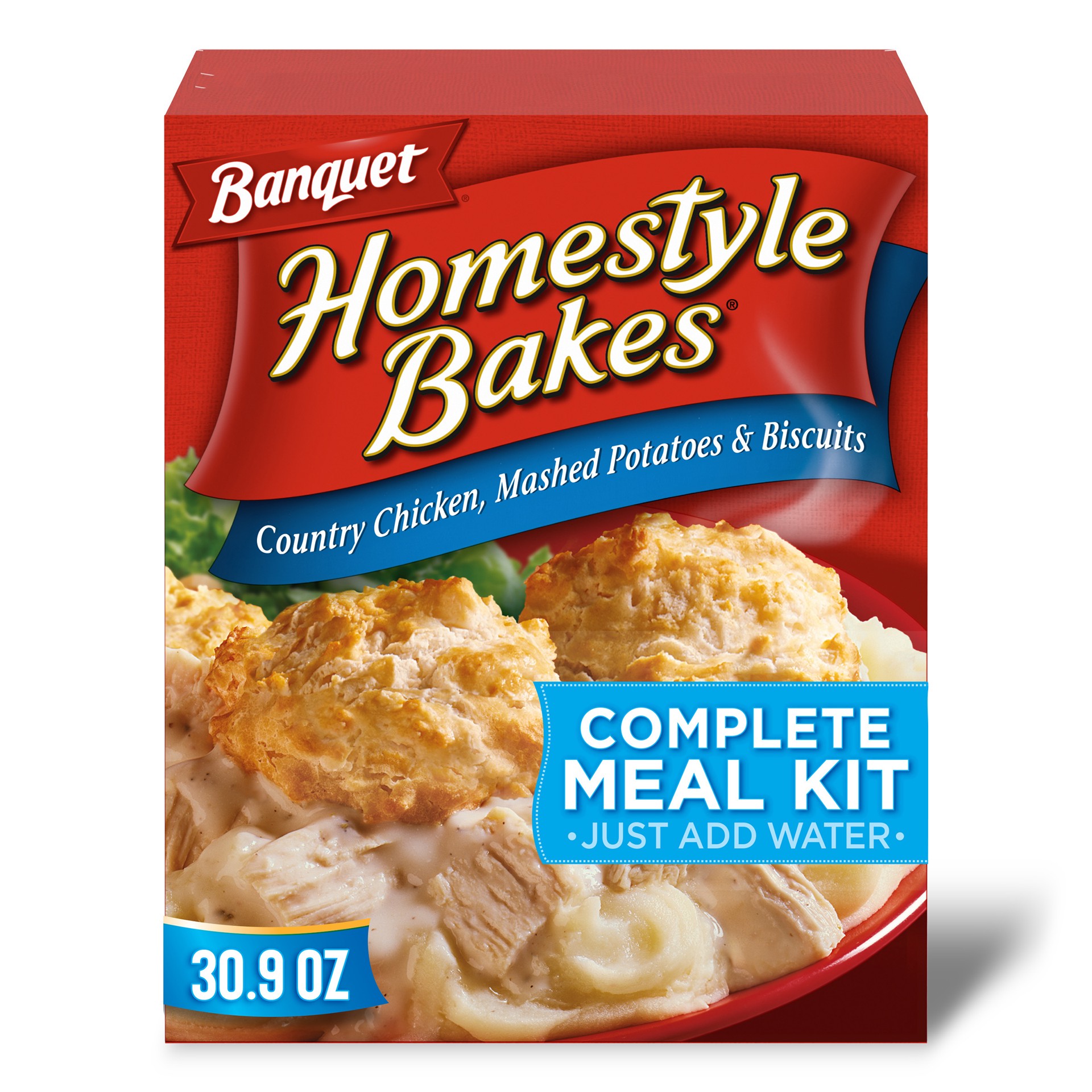 - One 30.9 oz Banquet Homestyle Bakes Country Chicken, Mashed Potatoes and Biscuits meal kit