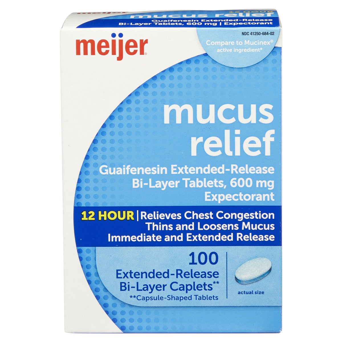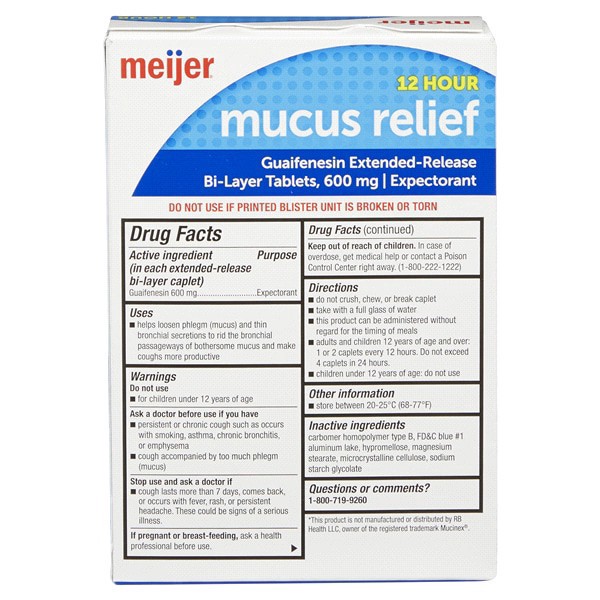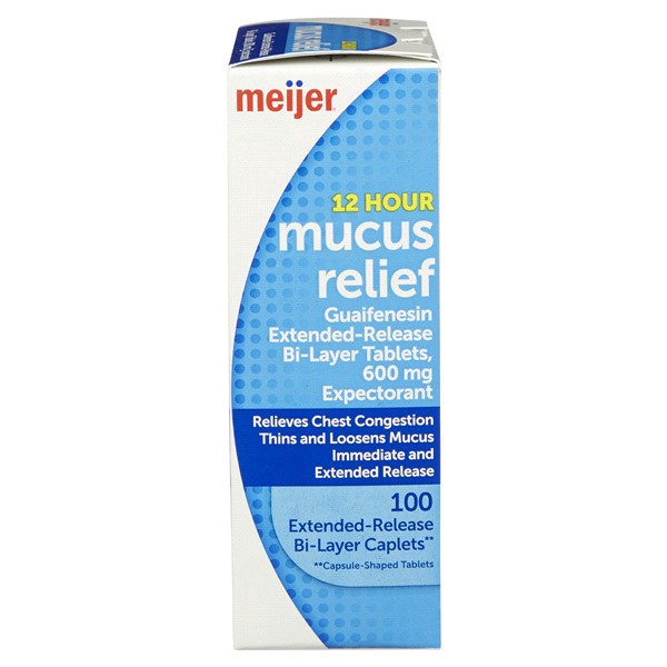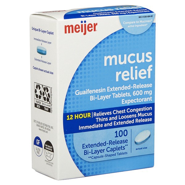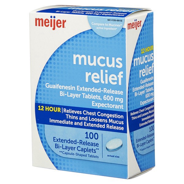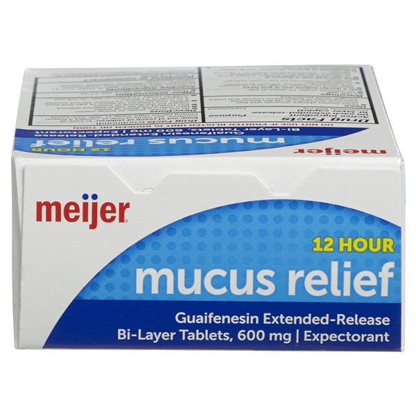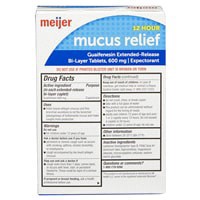 Compare to Mucinex active ingredient. Meijer Cough and Mucus Relief ExtendedRelease Tablets, Guaifenesin 600 mg, help to thin and loosen mucus. This regular strength expectorant relieves chest congest…
